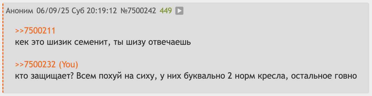 >>7500204 > Попытки сойти за здравый смысл ещё смешнее this здравому человеку очевидно, что несколько тредов подряд нападать на сиху и искать чиркашного протыка со скобками это какая-то болезнь, будто его этим сиху в детстве ебали