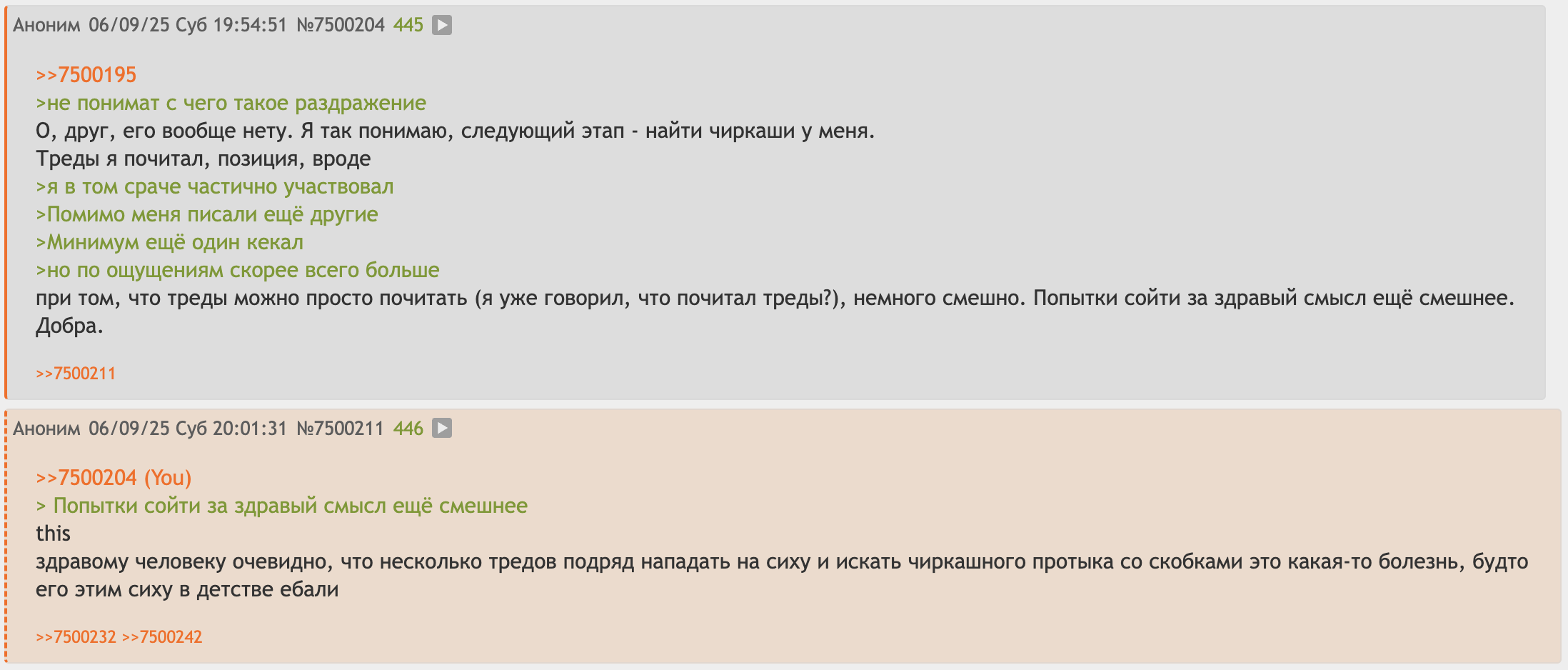 >>7500195 >не понимат с чего такое раздражение О, друг, его вообще нету. Я так понимаю, следующий этап - найти чиркаши у меня. Треды я почитал, позиция, вроде >я в том сраче частично участвовал >Помимо меня писали ещё другие >Минимум ещё один кекал >но по ощущениям скорее всего больше при том, что треды можно просто почитать (я уже говорил, что почитал треды?), немного смешно. Попытки сойти за здравый смысл ещё смешнее. Добра.