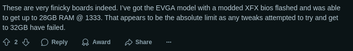 >>7492025 Там пишут что до 8 гигов только. Но это наверно просто больше чем 2гб модулей тогда не было. Про Х58 тоже писали что только до 24гб, а у меня с 48-ю работает