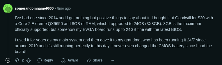 Даже сейчас, в реалиях 2025 года, при наличии помойки на коре дуба с более-менее вменяемой платой, есть смысл потратить 300р на условный E5430, немного погнать, и без слёз использовать десятую шинду, играть в нетребовательные дрочильни (ААА-кино не всем нужно), и смотреть ютуб в 1080п60.