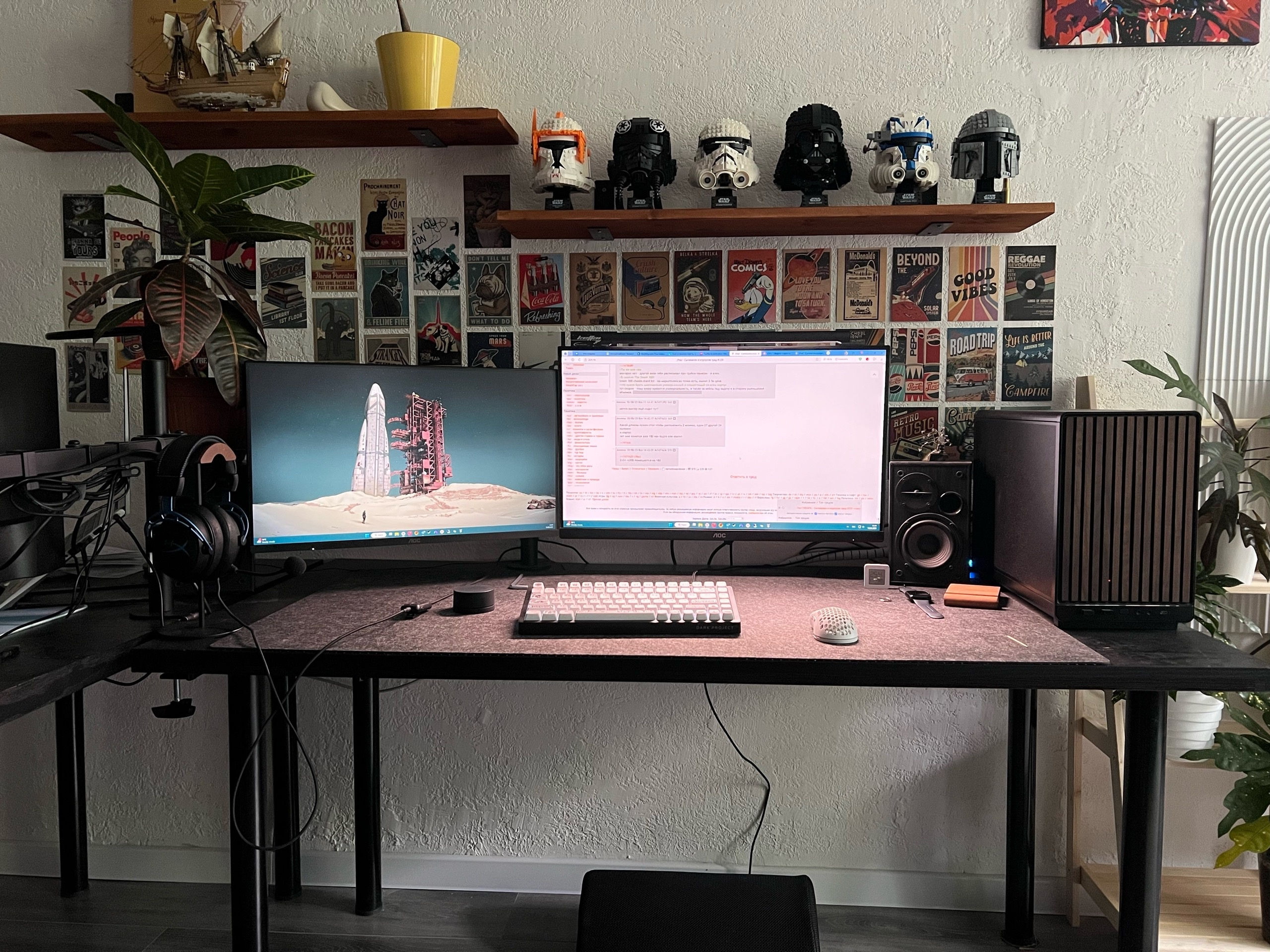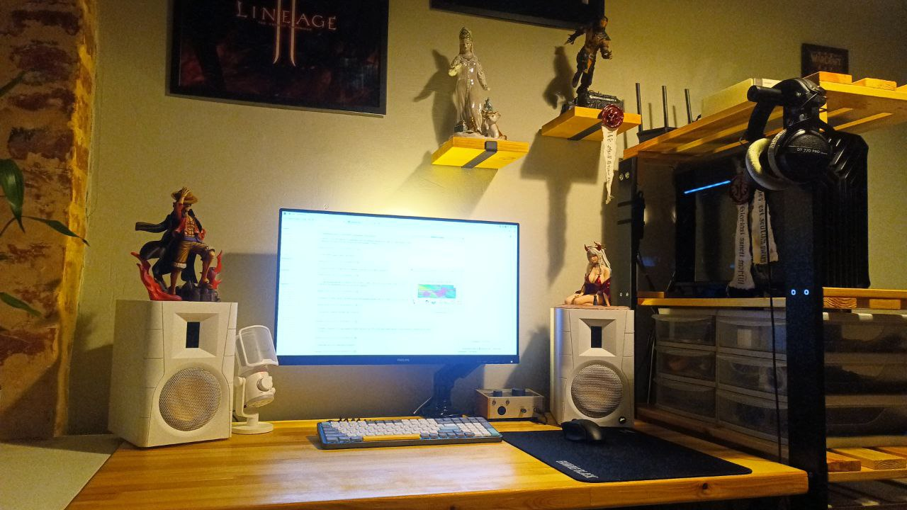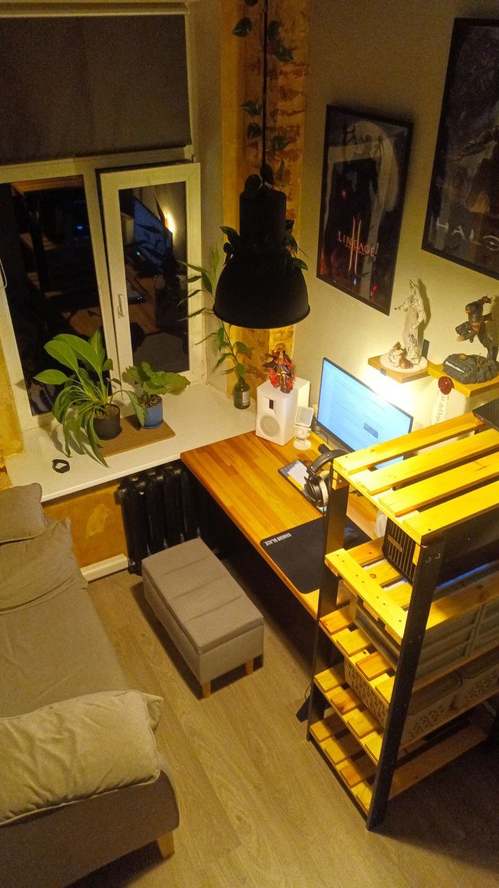Почему такой угловой стол мне нравится? Во-первых вещей много, но они все распределены в пространстве в высоту и нету ощущения какого-то нагромождения/хлама. Во-вторых угловой дизайн делает так, что с одной стороны всего дофига, но при этом все направлено в твою сторону и это мне кажется очень комфортно. Создает ощущение некой уютности. А современный дизайн это что? Безликий приямоугольный стол, на который кроме хв-стаффа по типу звуковухи, мыши, колонок больше ничего не положишь. А если положишь то будет создаваться впечатление стола какого-то офисного РАБа. Плюс заводское производство, и ручное по типу, купил ножки и захуярил столешницу сильно отличается. Сделав вручную стол он не выглядит как стол фабричного производства, где все аккуратно и ровно сделано. Поэтому я не буду брать столешницу с ножками, еще и ебаться с покрытием лаком