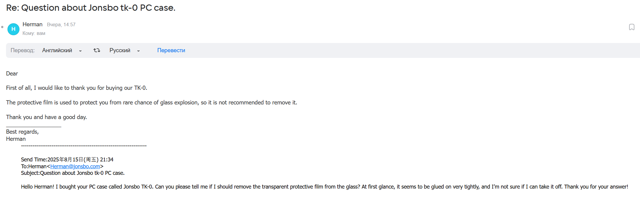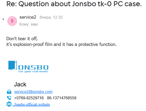 Аноны, доброй ночи! Являюсь обладателем корпуса Jonsbo tk-0. Приобрел его около полугода назад. На его боковом закругленном стекле есть пленка. Не обычная транспортировочная, которую принято снимать после сборки ПК. А специальная защитная пленка (как мне потом написал производитель). Мне не очень нравилось, как с ней выглядит системник, но так как она была приклеена очень крепко, я не решался её снять. Вчера у меня окончательно кончилось терпение и я сделал это. Не без труда, но я смог её оторвать (отодрать). Пришлось почти целиком облить стекло спиртом и антиклеем. И как обычно это бывает, осознание пришло только сейчас. Я написал производителю и вот, что он мне ответил (см. скриншоты). То есть, она нужна, чтобы стекло буквально не взорвалось! Но какова вероятность взрыва закалённого стекла и от чего это вообще может случиться? У меня теперь вместо системника на столе стоит бомба, которая в любой момент может выстрелить мне в рожу тысячами мелких осколков? Или мне не стоит париться по этому поводу? Заранее спасибо и два чая за ваши ответы.