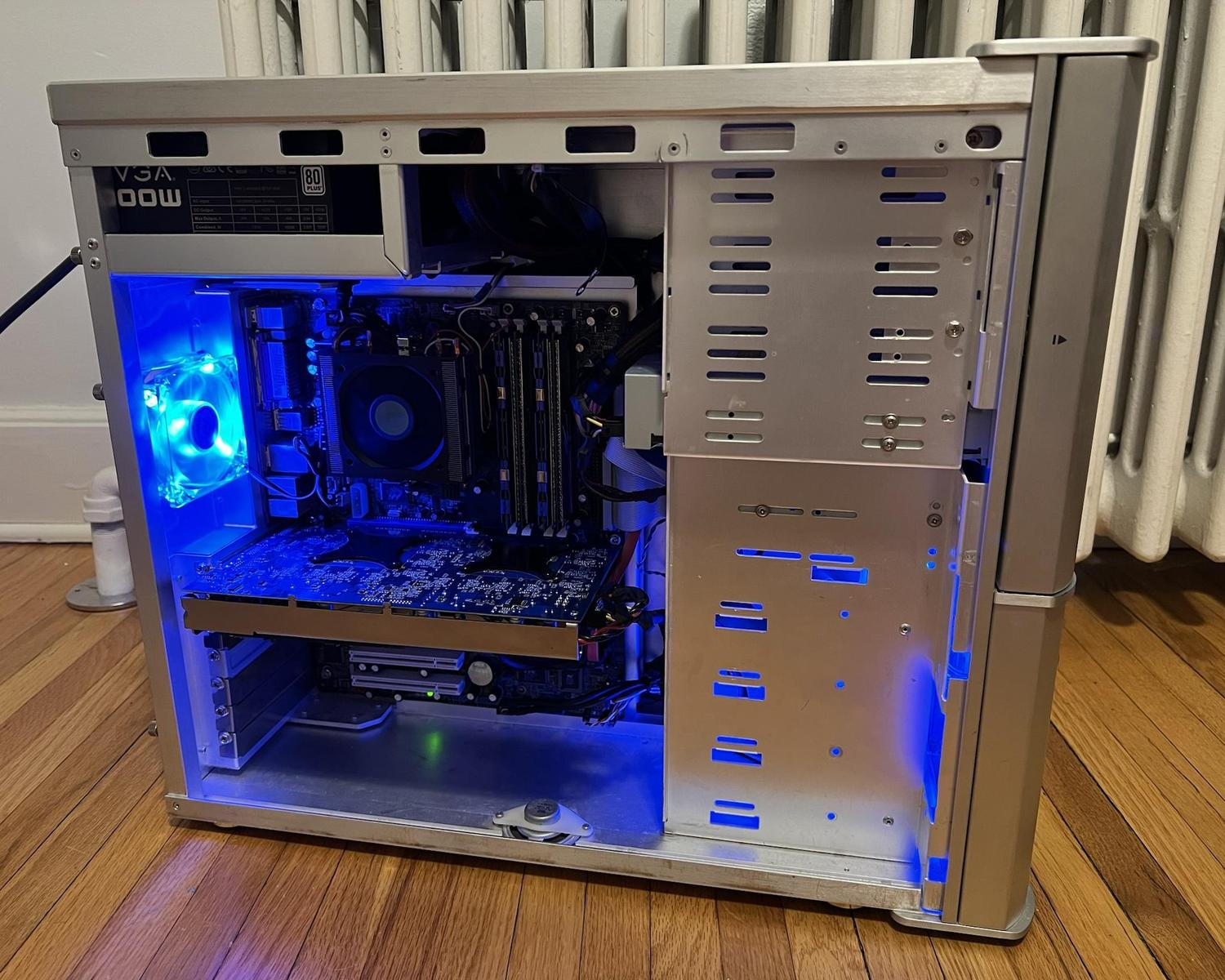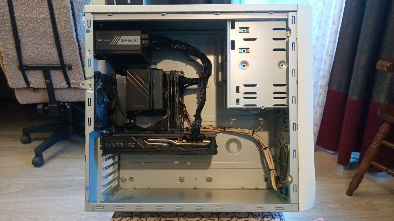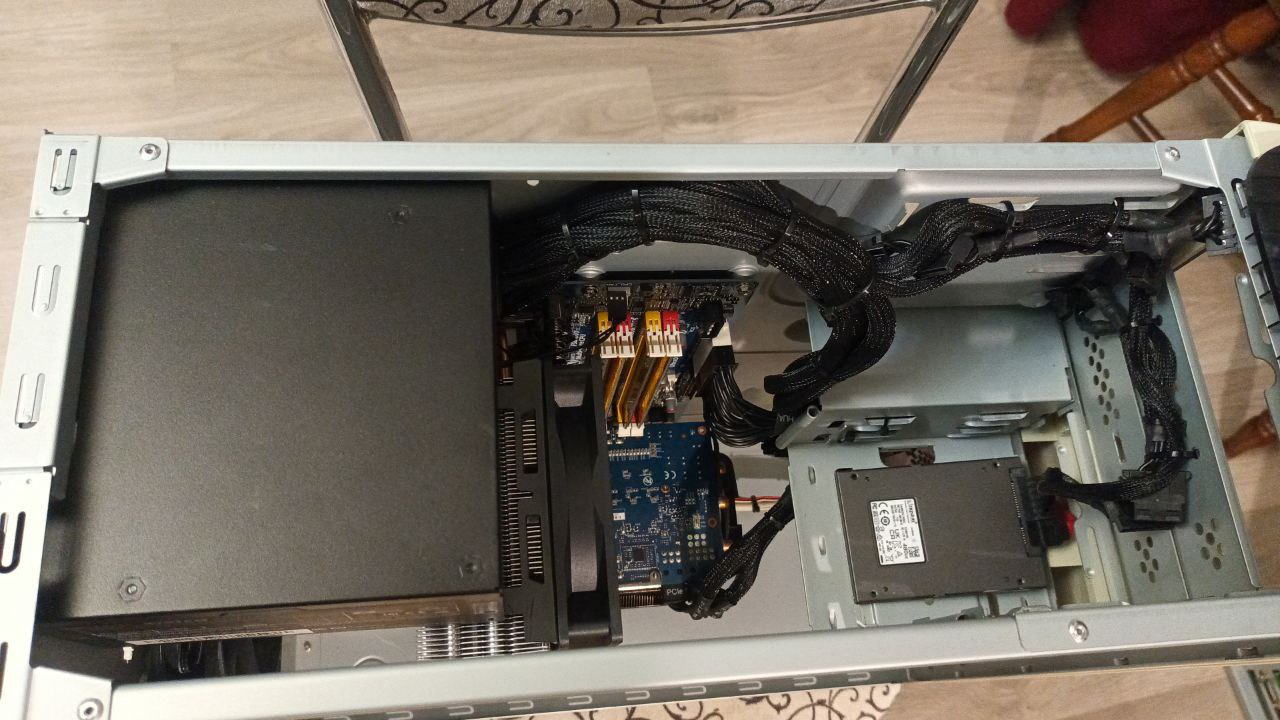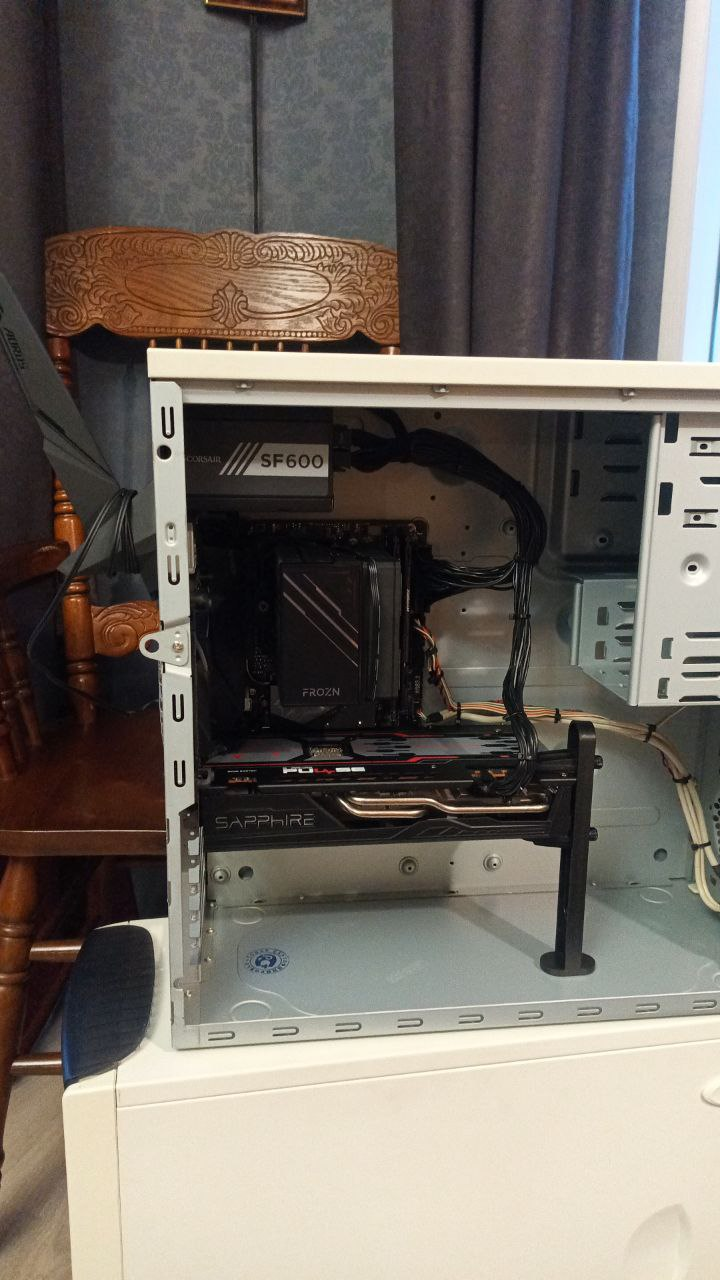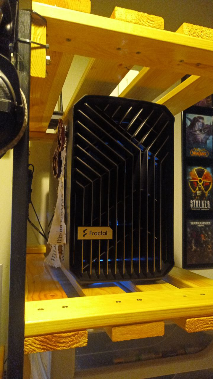 Джентльмены, представляю вам сборку уровня "мне похуй, я так чувствую". Собирал из всего, что было под рукой. Под капотом r5600 и rx5700xt, а также два nvme и sfp 600wtt.