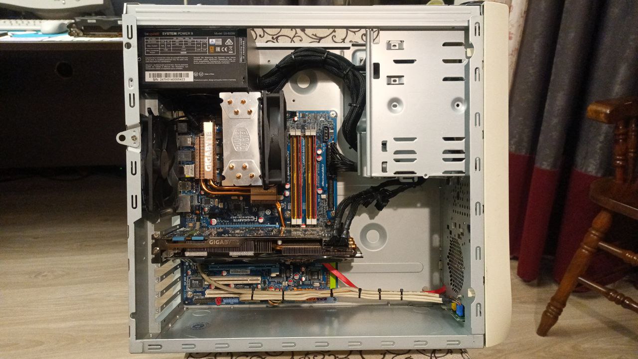 Едем дальше. Тут задачка была сложнее, в виду того, что блок не модульный, так ещё и sata добавился. Но справился. Вид без крышки сверху, чтобы понятно было, куда плющ растёт. Под капотом q9650, gtx670, 480gb ssd, 4gb ram и 600wtt блок. Тачка под хрюшу-семёрку.