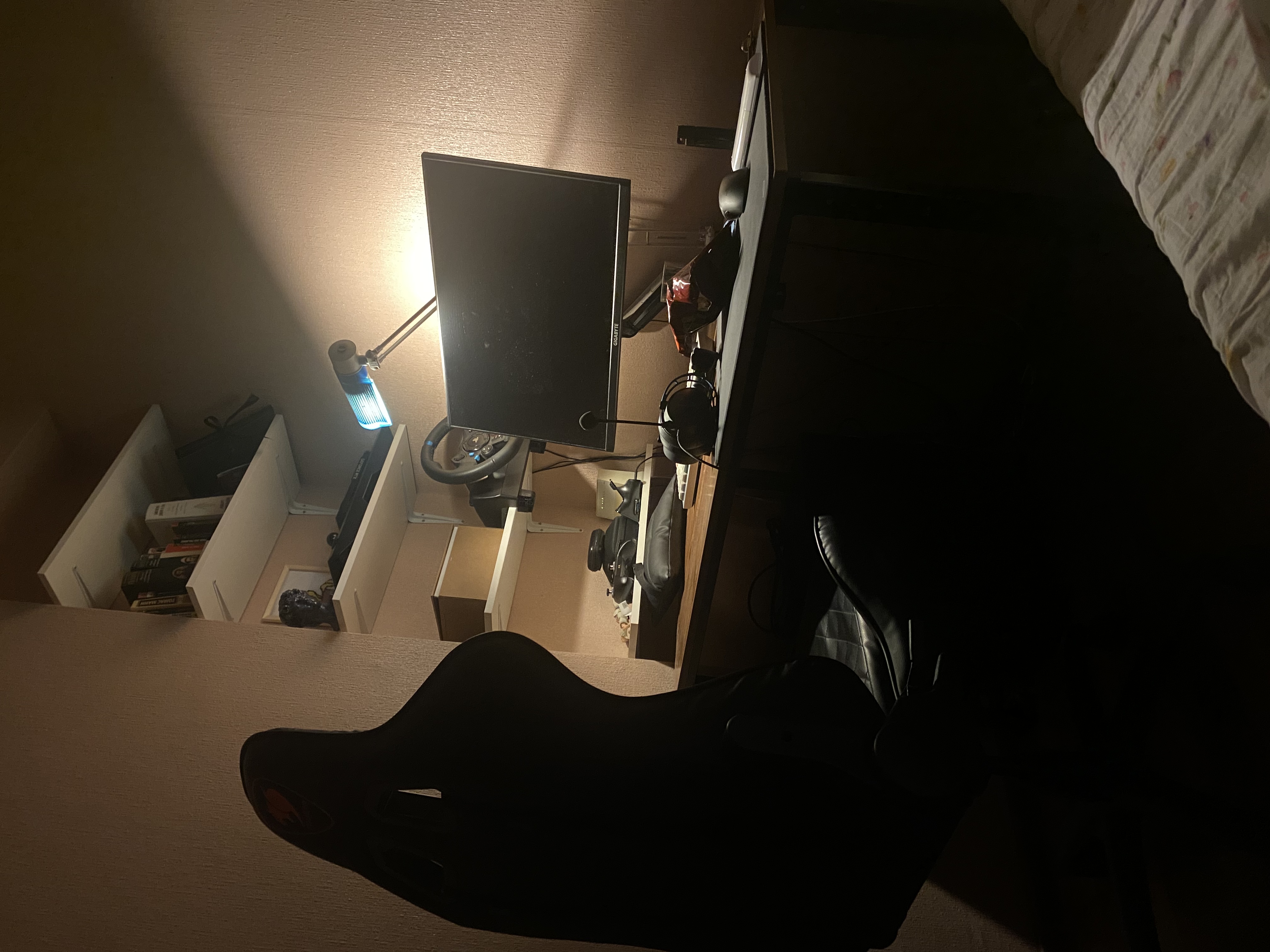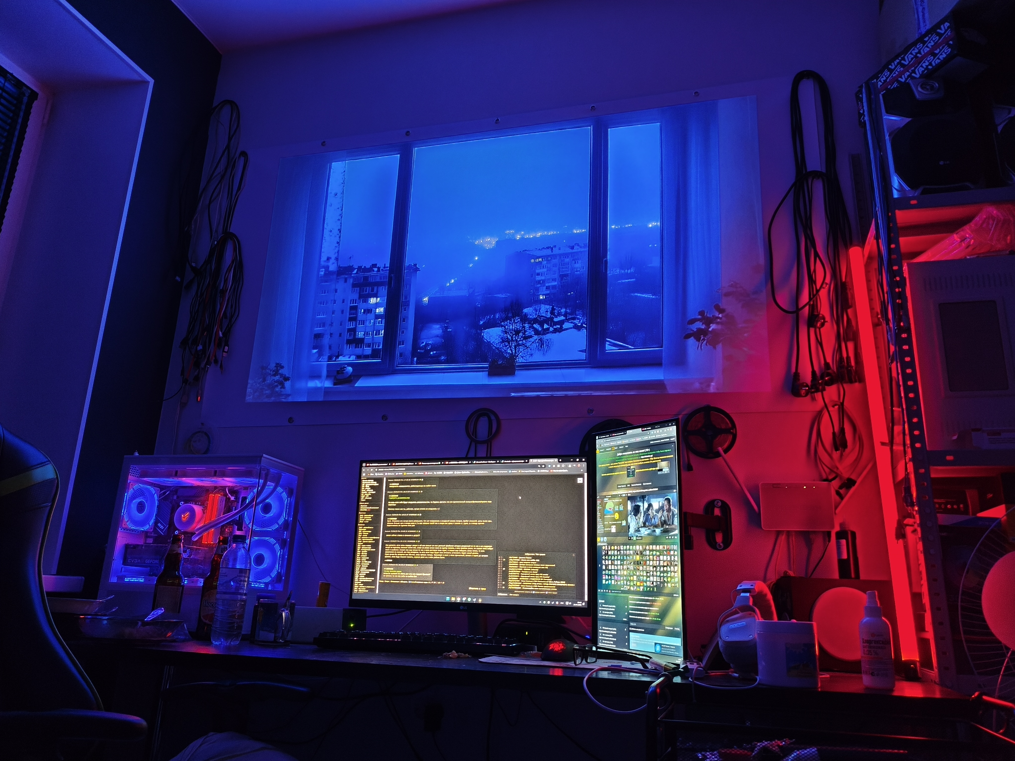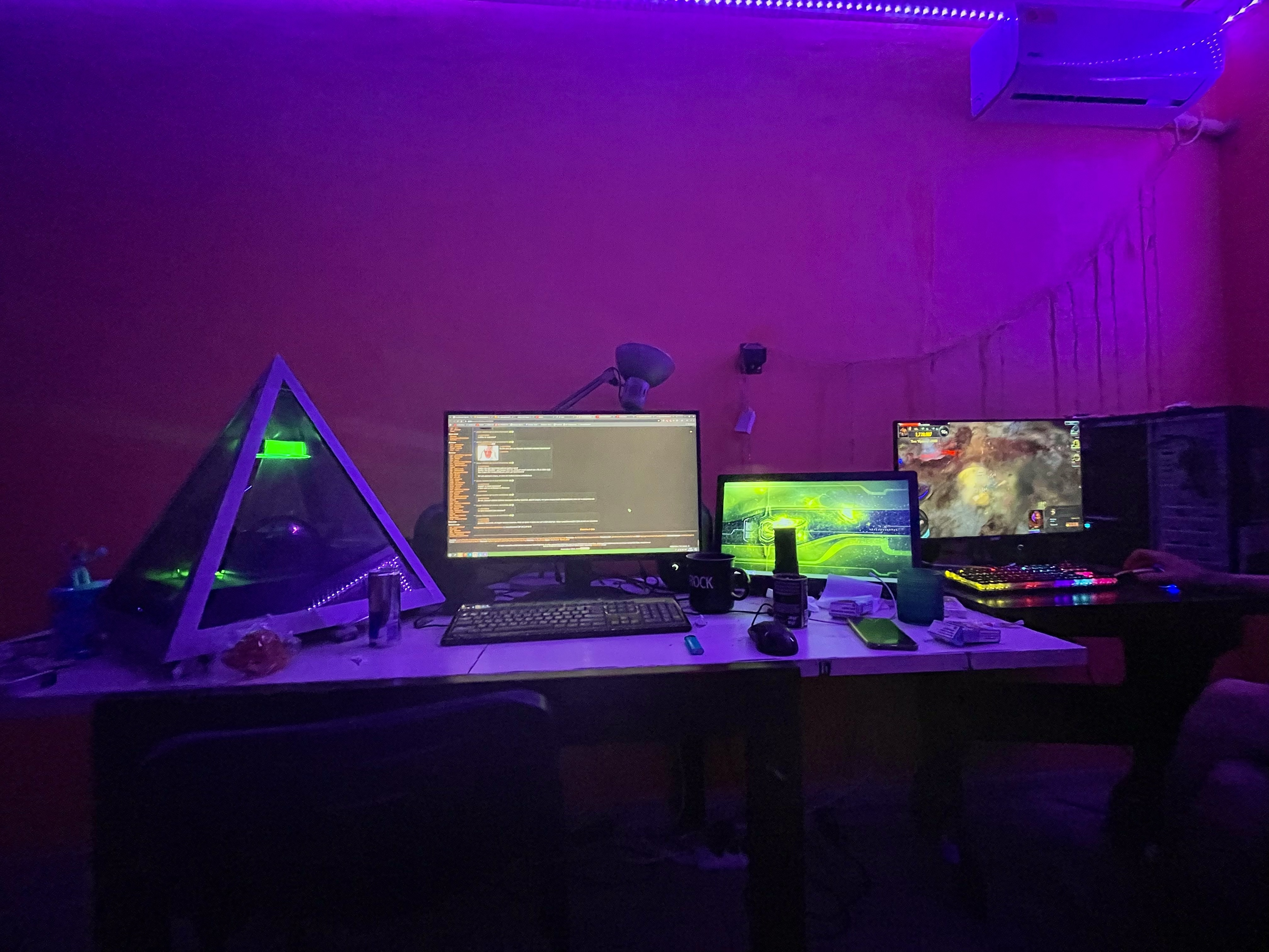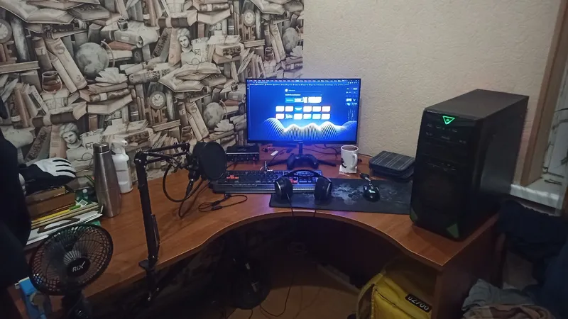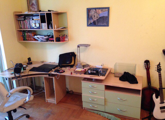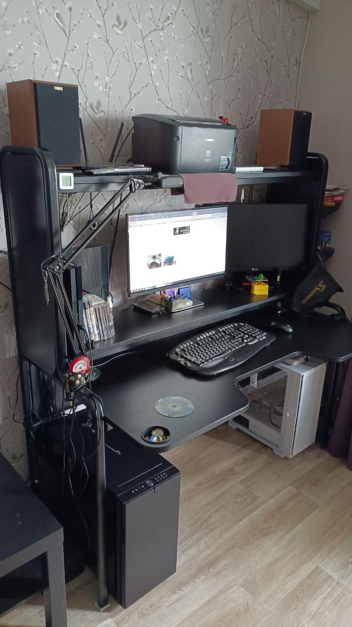>>7486101 Стол выглядит неплохо, я бы от такого не отказался. В остальном, конечно, печально и по валяющимся проводам, и по "подставкам" для маняторов вместо кронштейнов.