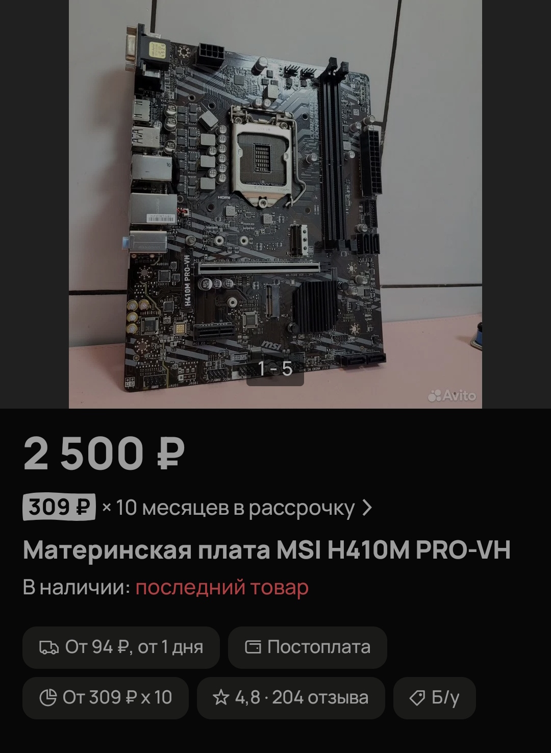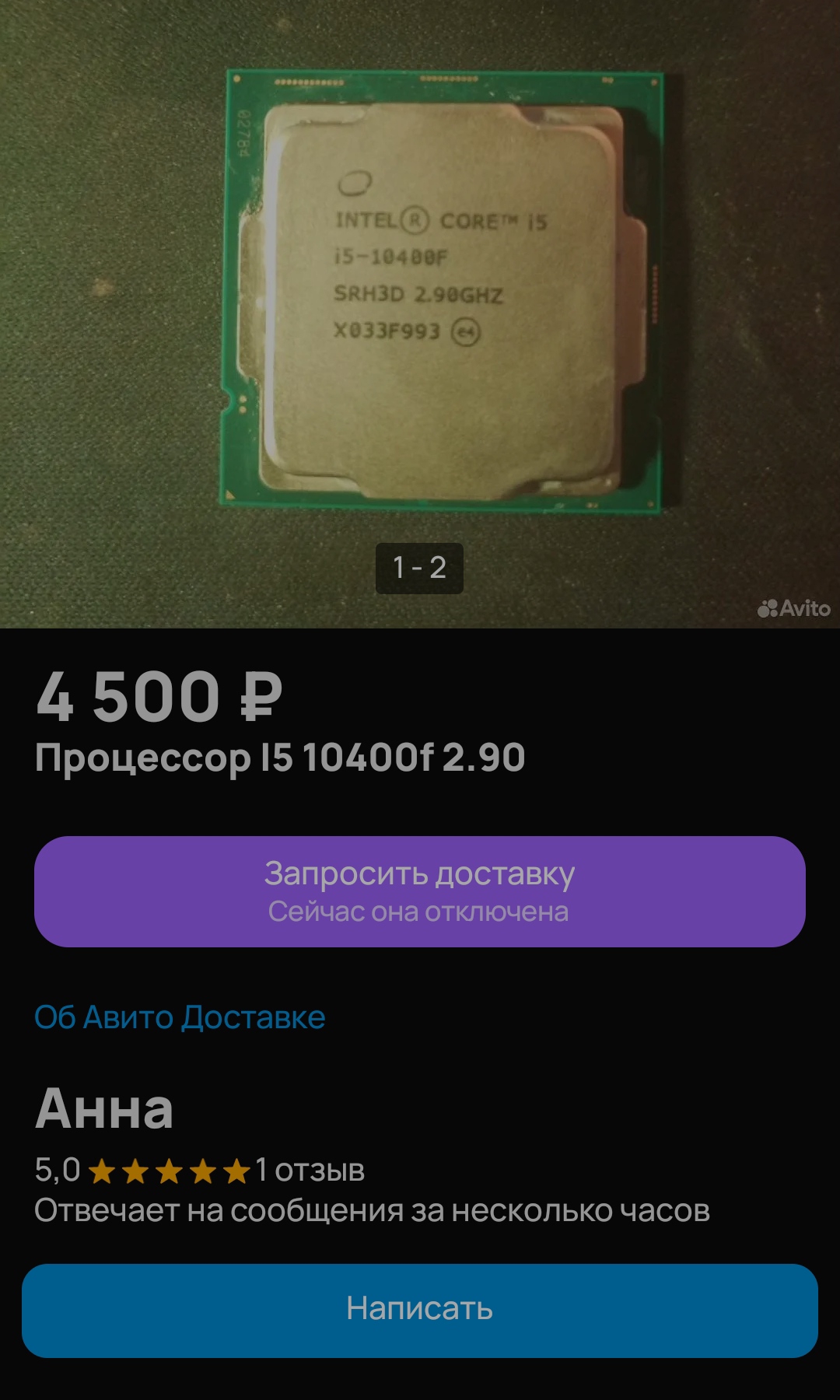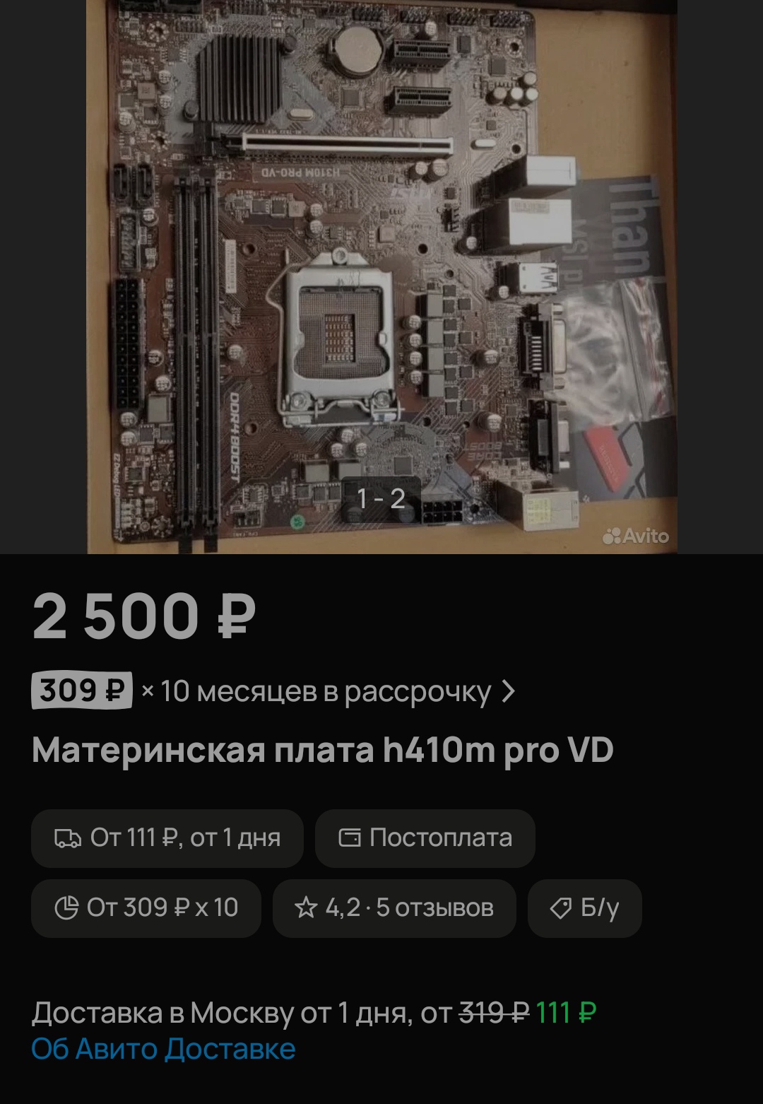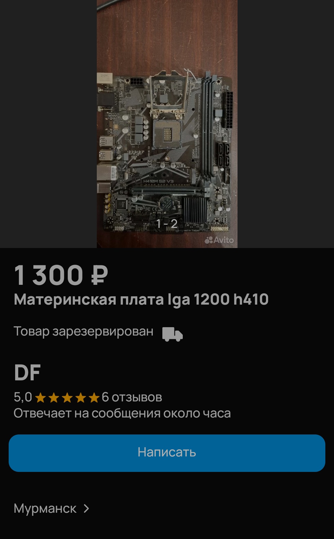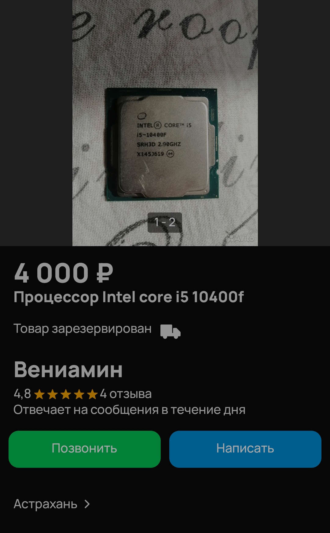 >>7478464 >прямо щас можешь залезть на авито и убедиться >10400f 4к Какой же ты пиздабол, вот за 5200р купили, следующий нормальный лот начинается от 5.5к + доставка 300-600р. И это я еще не дошел до самого пиздеца, покупки материнки через авито. Второй момент,ты сравниваешь сборку с авито с готовой сборкой за 5к с ВБ, если сравнивать с так же с сборкой на авито, то комплект выйдет в 4к. И какой еще кулер за 1к для 50ватного зиона? Короче, сделай доброе дело, не пиши свою хуиту в треде.