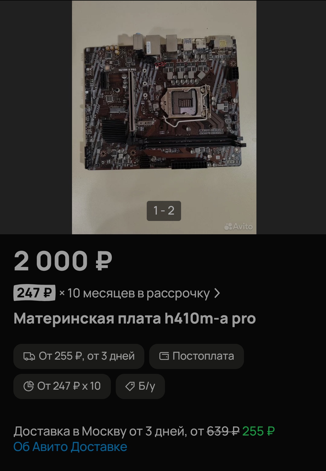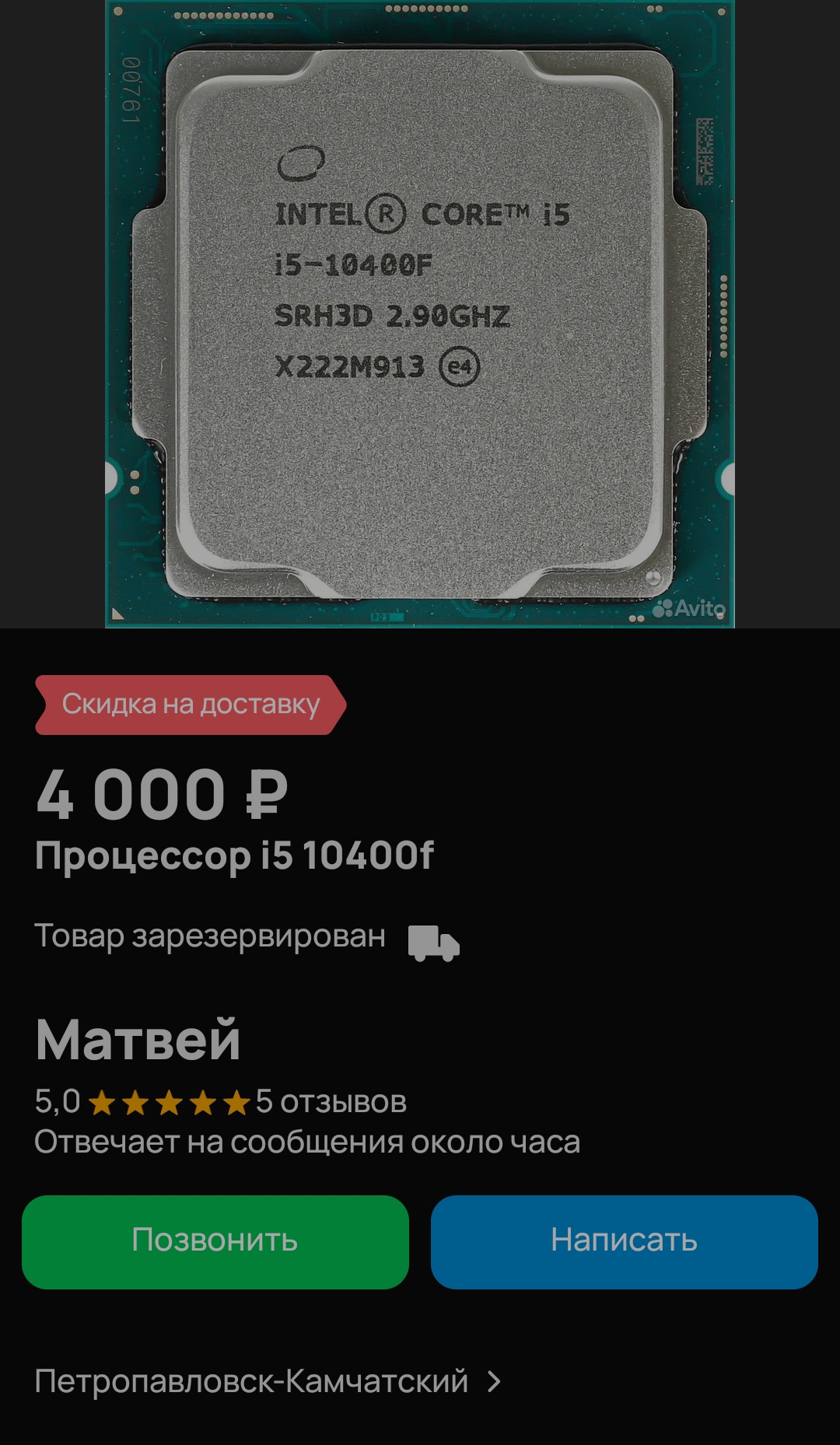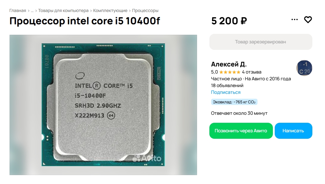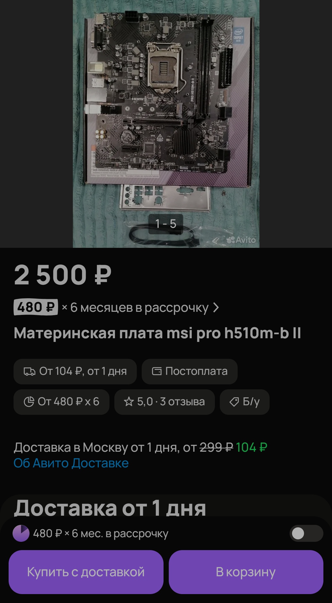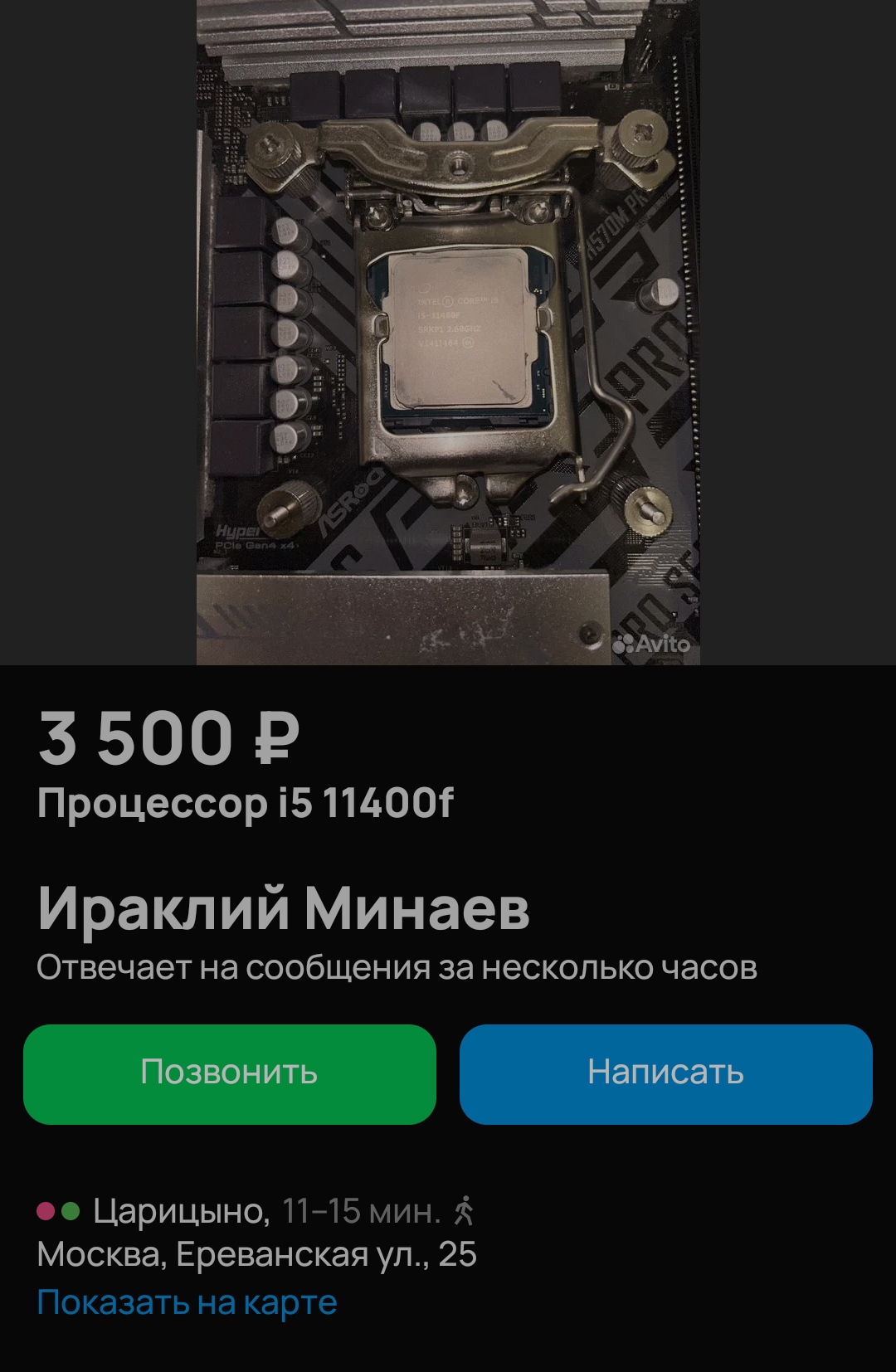 >>7478464 >прямо щас можешь залезть на авито и убедиться >10400f 4к Какой же ты пиздабол, вот за 5200р купили, следующий нормальный лот начинается от 5.5к + доставка 300-600р. И это я еще не дошел до самого пиздеца, покупки материнки через авито. Второй момент,ты сравниваешь сборку с авито с готовой сборкой за 5к с ВБ, если сравнивать с так же с сборкой на авито, то комплект выйдет в 4к. И какой еще кулер за 1к для 50ватного зиона? Короче, сделай доброе дело, не пиши свою хуиту в треде.