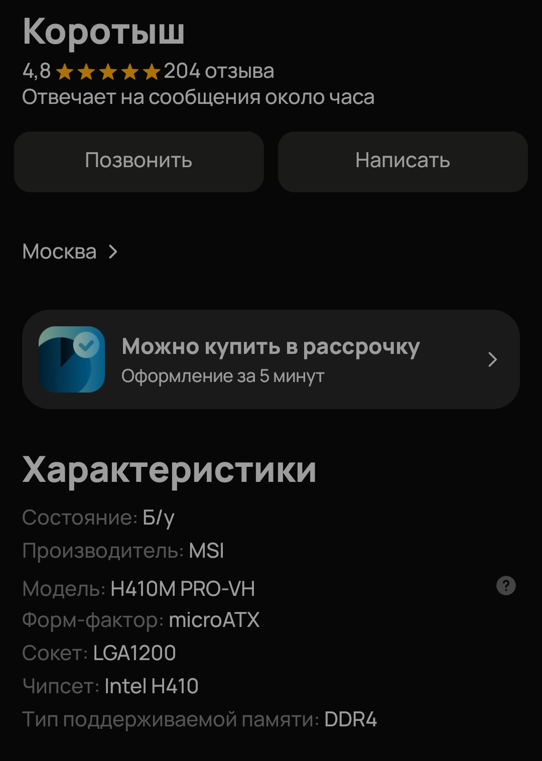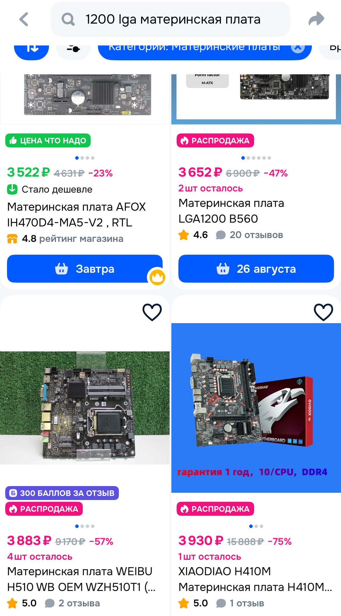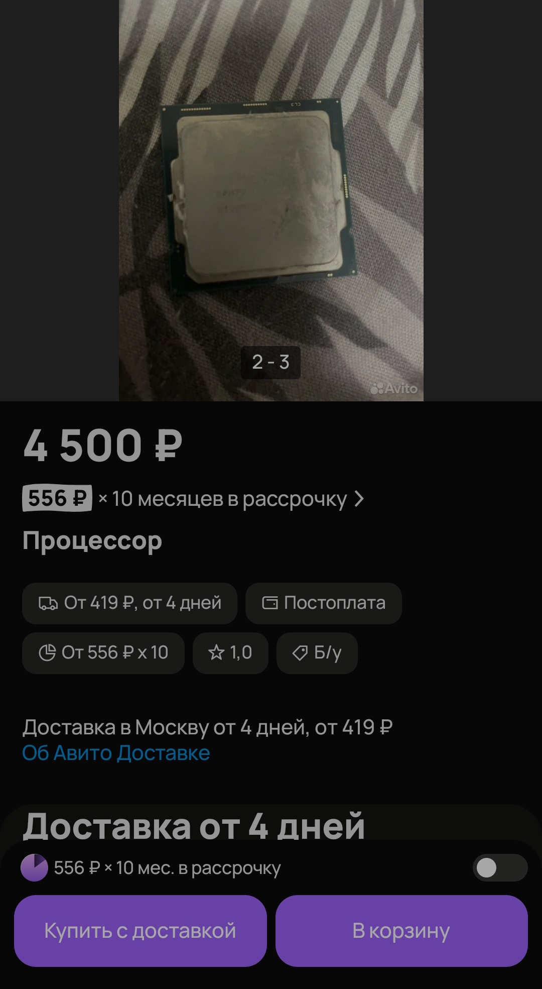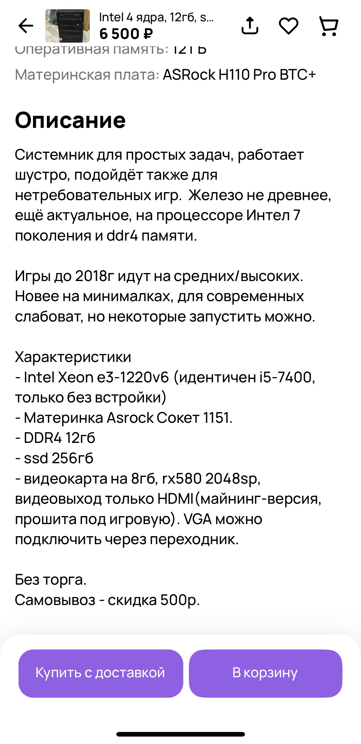 >>7478464 >прямо щас можешь залезть на авито и убедиться >10400f 4к Какой же ты пиздабол, вот за 5200р купили, следующий нормальный лот начинается от 5.5к + доставка 300-600р. И это я еще не дошел до самого пиздеца, покупки материнки через авито. Второй момент,ты сравниваешь сборку с авито с готовой сборкой за 5к с ВБ, если сравнивать с так же с сборкой на авито, то комплект выйдет в 4к. И какой еще кулер за 1к для 50ватного зиона? Короче, сделай доброе дело, не пиши свою хуиту в треде.