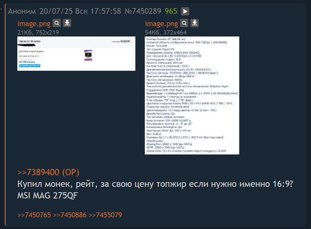 >>7476686 (OP) Приехал ко мне этот щидевр китайского инжиниринга, битых пикселей не оказалось, картинка приятная, яркая (на 100 слепит, на 70 норм) и плавность по сравнению с прошлым на 60 радует, от засветов на черном импакта вообще не ощутил и они не показались мне критическими даже на черном экране. Играю в основном на 1280x720 используя целочисленное масштабирование и плавность существенно повысила погружение в игори, советую всем поиграть в гонки которые выдают 200+ фпс если купили себе подобный моник, даже в низком разрешении. Хотелось бы пленку антибликовую снять что моя шиза и мечта уже целый год но боюсь что опять угрохаю монитор и мамка больше не даст денег на новый. Один Dell 2007fp уже так улетел в таверну и я хуй знает можно ли его починить, возможно даже не матрица умерла а шлейф к ней который очень крепко сидел и неплохо помялся когда я его вынимал и вышел уже с отломанным металлическим креплением.