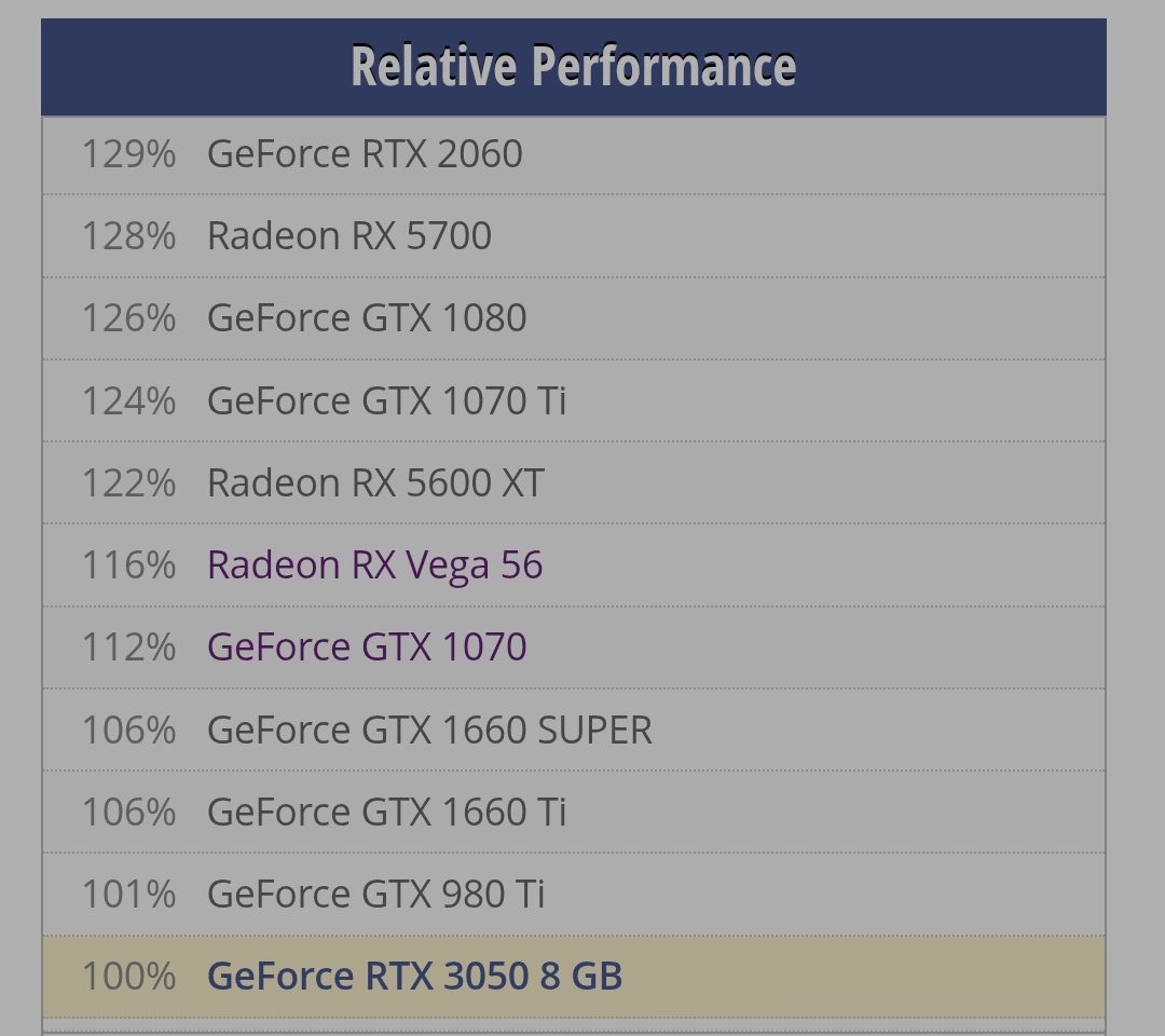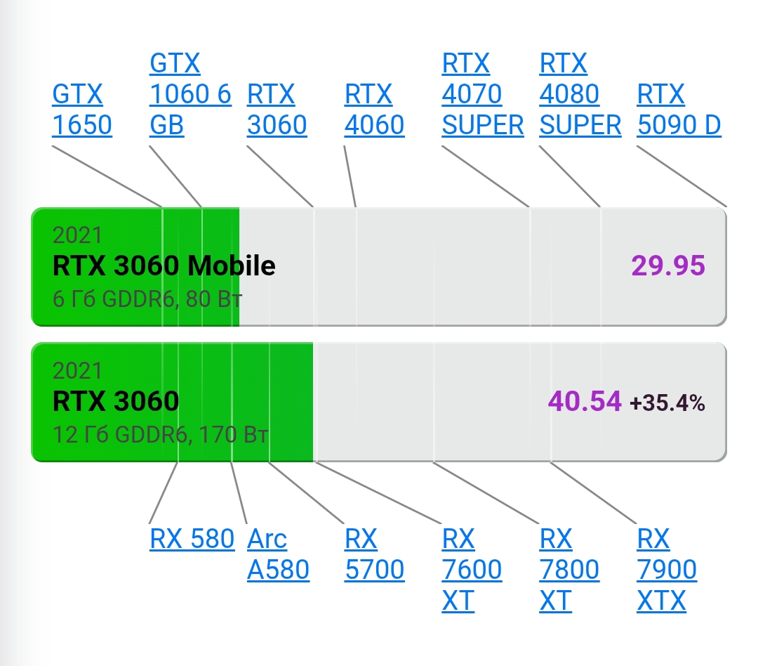 >>7488421 3050 это уровень 1070 всегда был. Может в новых играх уже до 1080 добила. И вряд-ли она быстрее 1660с. В тестах они на равных идут. В том же киберсреньке. >>7488425 > 1070ти Не, не стоит. В этом году последние дрова на это поколение выходят. Плюс жрет до хера. Плюс чуть ли не все волны майнинга зацепила. 1660с/ти, 3050 - если устроят средние 150 кадров на минималках. 2060/2060с, rx 5700 - если хочешь запас процентов ~20. Печки 1ххх в пролете из-за дров. Печки 3ххх уже дорогие. Можешь чекнуть почём у тебя rx 6600, она почти как 2060с, ток холоднее. Тоже неплохой выбор будет.