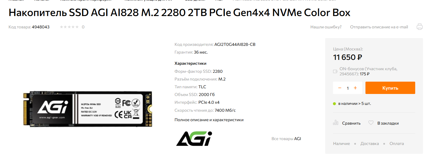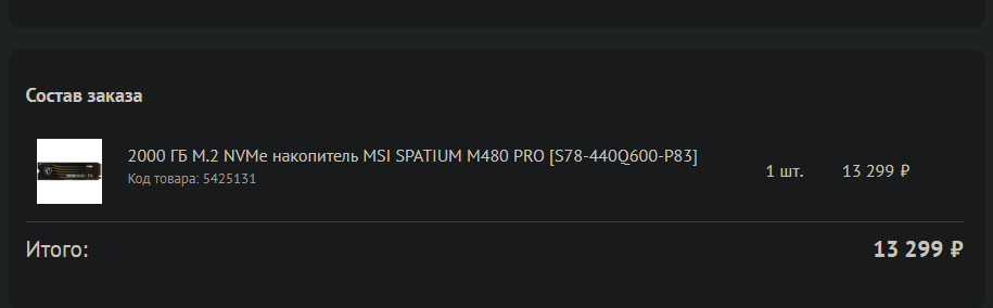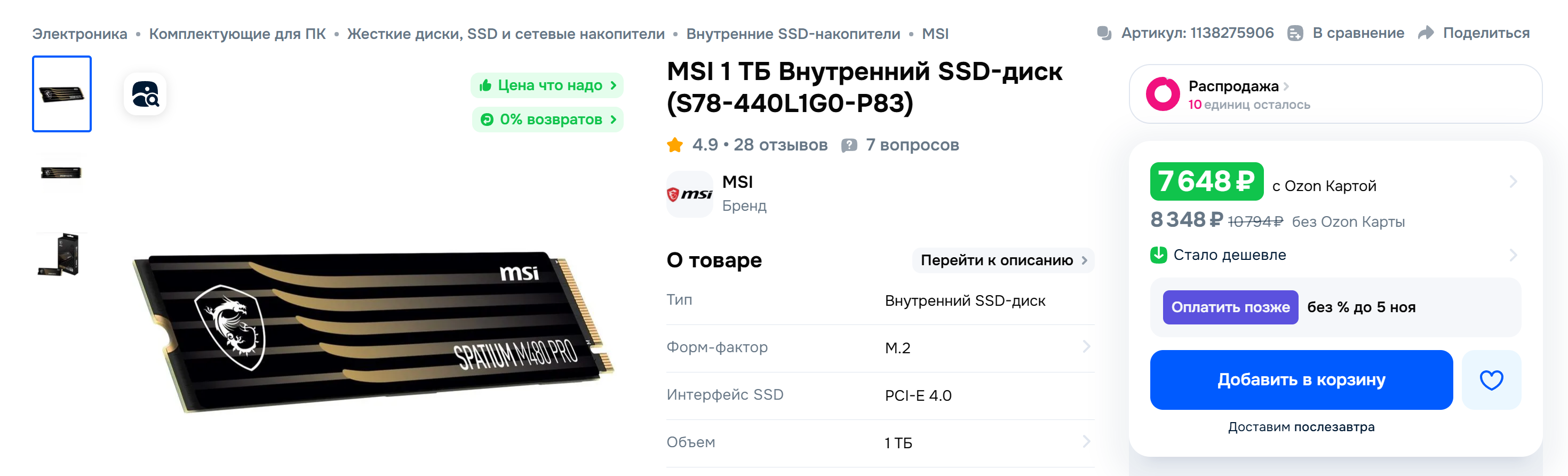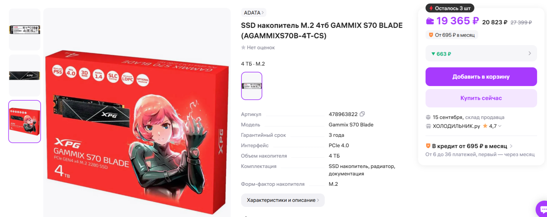 Я чёт трясанулся, и заказал. >>7496684 я же Без оплаты, просто заказал на доставку в магазин, там может полежать пару дней. 4терабайтник стоит дороже, чем две по 2. две по 1 стоят дороже, чем двухтерабайтник. s770 на вб стоит дороже, чем пик. Разве что с алика брать. Немного жаба душит, но ощущение, что я уже и не смогу ничего подобного урвать за такую цену. Хз почему вообще в сентябре на него понизили ценник. Особенно учитывая, что в двух тредах этот ссд считают одним из лучших выборов, а альтернативы дороже. Ну ещё раз спасибо тредику. Они ж не повысят цены уже после заказа до оплаты.