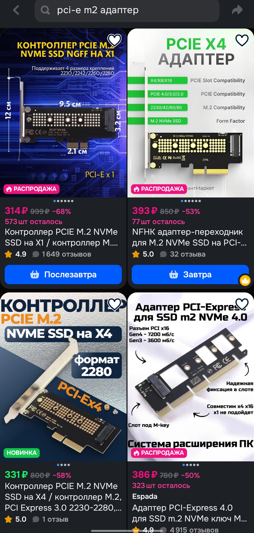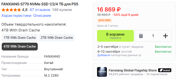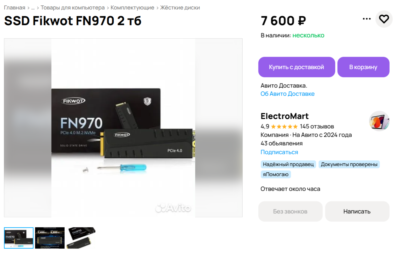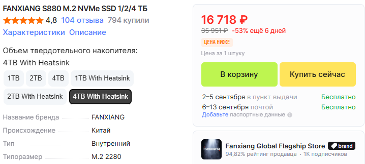 Я чёт трясанулся, и заказал. >>7496684 я же Без оплаты, просто заказал на доставку в магазин, там может полежать пару дней. 4терабайтник стоит дороже, чем две по 2. две по 1 стоят дороже, чем двухтерабайтник. s770 на вб стоит дороже, чем пик. Разве что с алика брать. Немного жаба душит, но ощущение, что я уже и не смогу ничего подобного урвать за такую цену. Хз почему вообще в сентябре на него понизили ценник. Особенно учитывая, что в двух тредах этот ссд считают одним из лучших выборов, а альтернативы дороже. Ну ещё раз спасибо тредику. Они ж не повысят цены уже после заказа до оплаты.