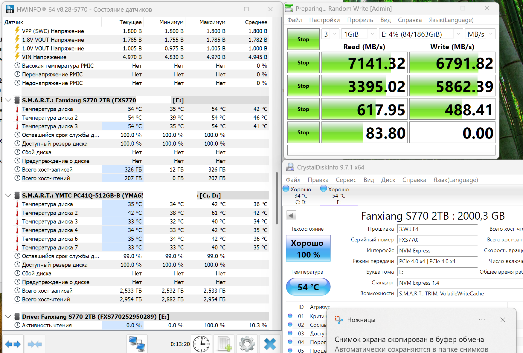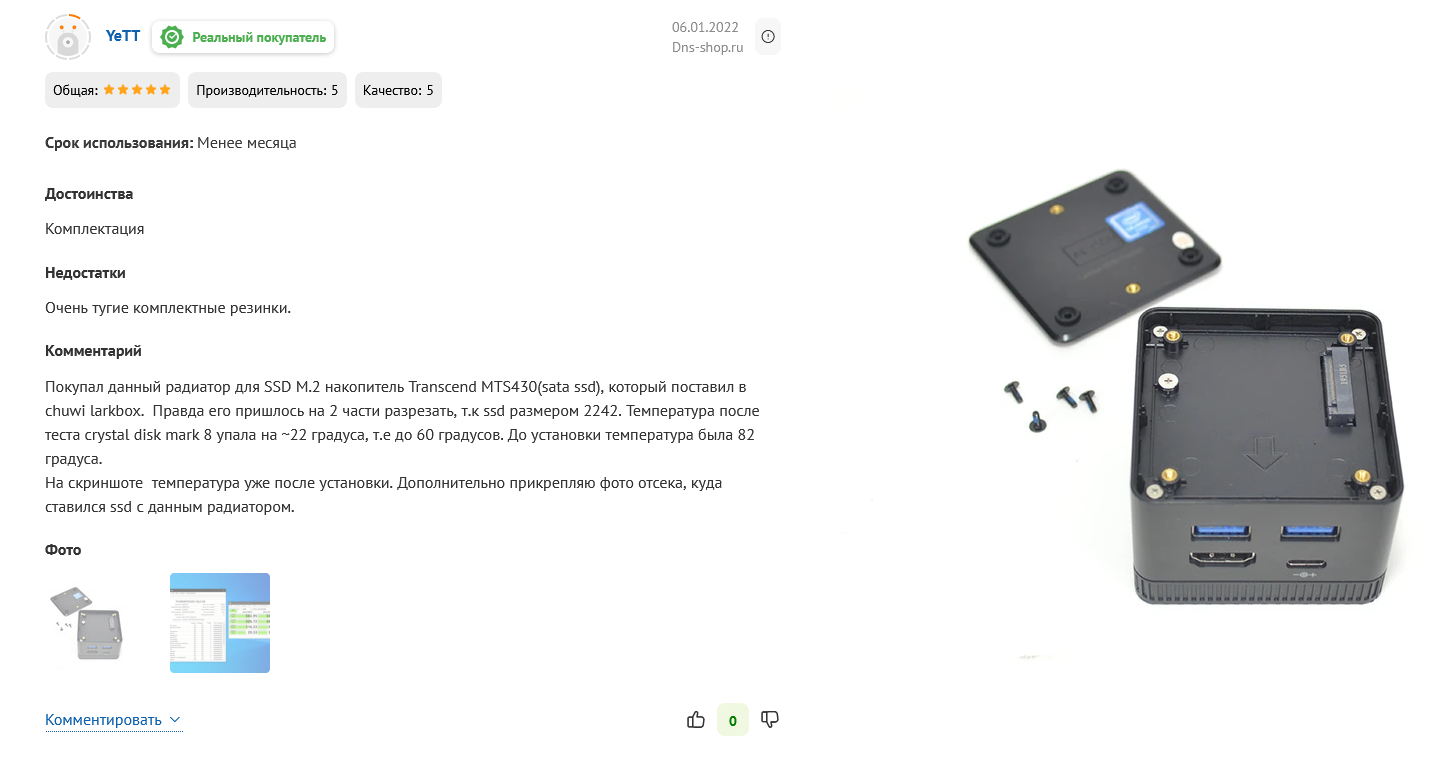 Повозился с ним, понял что отъебывает раз за разом и очень быстро. Понес возвращать. Там его подключили на стэнд и никакого перегрева и отъеба не было, диск работал идеально. И в кристалл диске тесты гоняли, и другие. Я настоял - просто гоняли на самозапись файлы минут 15, чтобы максимальный загруз был. Не разогрелся на родной пластинке псевдорадиатора выше 56 градусов. Я даже заподозревал что датчик пиздит, потрогал пальцем ссд - реально температура такая. А у меня он просто на чтении файлов прогревался так что руки обжигал.