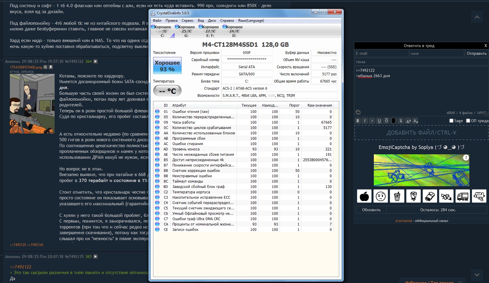 >>7497408 >заняты все порты, видюхой, аудюхой и wi-fi картой Почему не купить внешний ЦАП (и звук будет в разы лучше), и нормальный роутер? И вообще, если нет nvme, твоему системнику минимум 10 лет, может пора обновится? >>7497419 В 2021. Но есть сообщения, что попадаются модели вплоть до 2024 года с этим браком по памяти. >>7497233 Сканируй раз в месяц через мagician. Смотри, нет ли роста атрибута 252 и бэдов. Если есть, сдавай по гарантии. >>7497432 >850 Pro (последняя модель с честным MLC) А как же 860 Pro, 970 Pro, SM883? И что покупать, если самс говно?