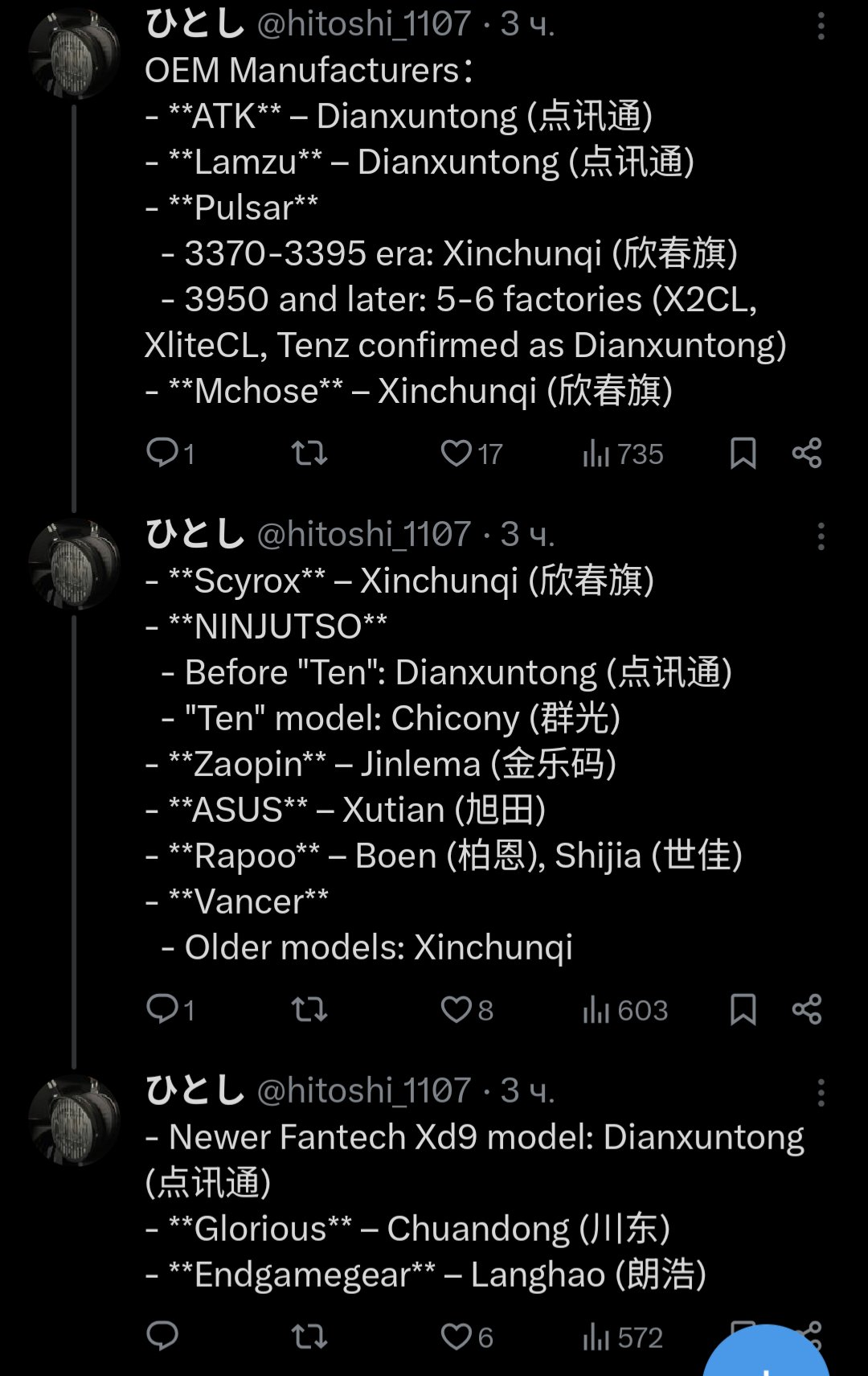 Из того что я накопал: ATK, VXE, VGN, G-wolves, Lamzu, Fantech, Ardor, Pulsar, Ninjutso - сейчас делают на конвейере Dianxuntong Electronic Skyrox, MCHOSE - это цех Shenzhen Xinchunqi Technology Co. ZAOPIN - это Shenzhen Jinlema Electronic Technology Co. DELUX, DARMOSHARK - не нашел инфы многие постоянно меняют заводы, соответсвенно качество скачет пиздец, тот же ламзу прыгает с завода на завод