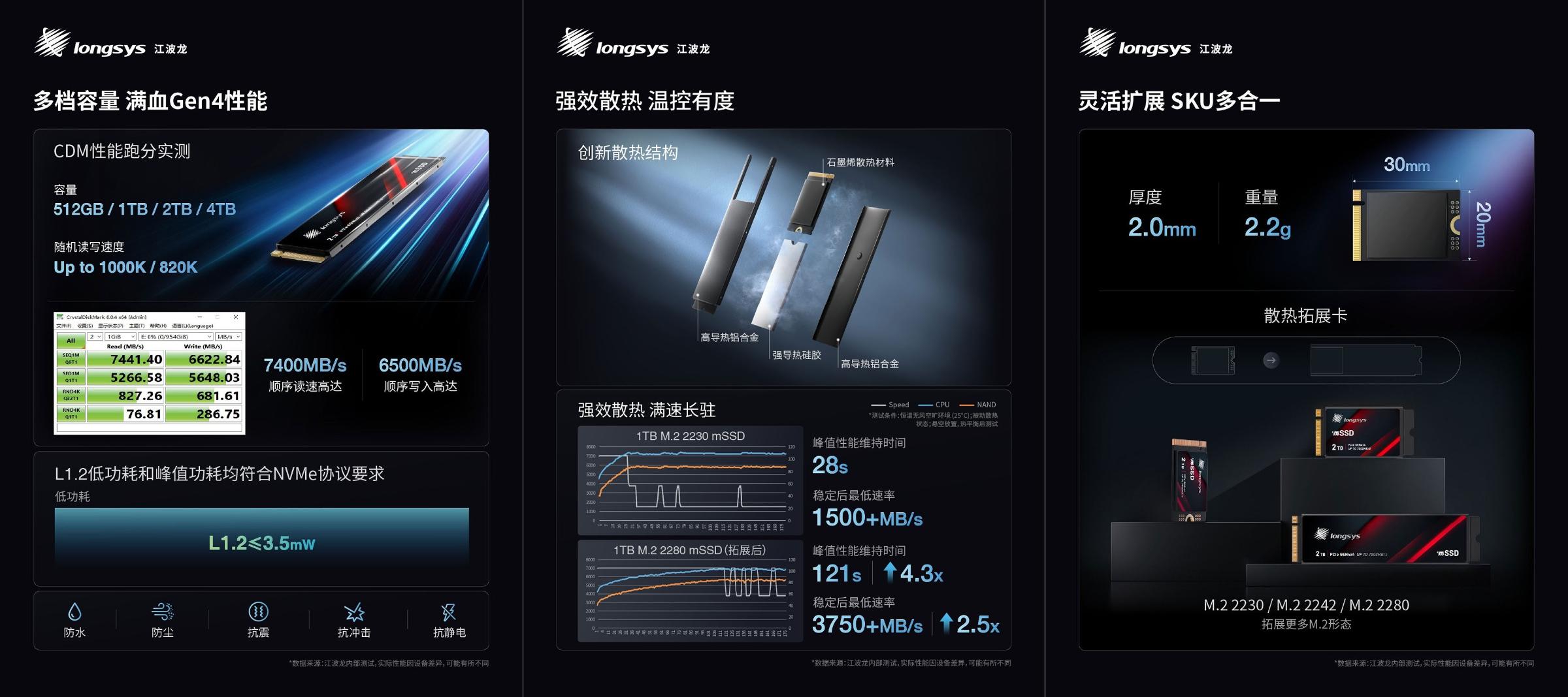 Первые накопители mSSD от Longsys будут использовать интерфейс PCIe 4.0 x4, TLC и QLC флэш-память. В серию войдут модели ёмкостью от 512 ГБ до 4 ТБ с пиковой скоростью 7,4 ГБ/с на операциях чтения и 6,5 ГБ/с на операциях записи. На случайных операциях чтения и записи блоками по 4 КБ производительность оценивается показателями 1000 тыс. и 820 тыс. операций ввода-вывода в секунду (IOPS) соответственно. Для накопителей также выпустят специальные модули-расширители до форматов M.2 2280, 2242 и 2230, одним из предназначений которых является дополнительное охлаждение.