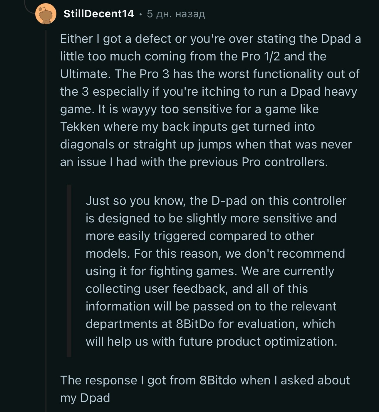 Единственное до чего можно было реально доебаться в теме 8битду раньше, что у них онли для ретро игр пады, на что те выкатиили серию ультимейт. Хуй бы с ним покрыли все потребности они пошли дальше и выкатили апдейт к про3 сделав его ультимативным выбором вообще для всего. Под кал оф дути и прочие шутеры? Пожалуйста тмр стики, 4 доп кнопки, гироскоп, динпут, тригерстоп. Под ретро? Пожалуйста, лучшая крестовина на рынке, нинтендо сосёт хуй в углу и плачет, самые быстрые кнопки справа. Под эмуляцию свича? Пожалуйста, всё тот же гироскоп. Ёбка тотальна, кем надо быть, чтобы выбрать вместо про 3 вейдер или калсир я хз.