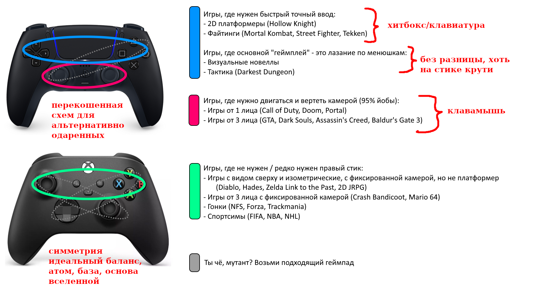 Игры, где основной "геймплей" - это лазание по менюшкам: - Визуальные новеллы - Тактика (Darkest Dungeon) ## ДШ стики Игры, где нужно двигаться и вертеть камерой (95% йобы): - Игры от 1 лица (Call of Duty, Doom, Portal) - Игры от 3 лица (GTA, Dark Souls, Assassin's Creed, Baldur's Gate 3)