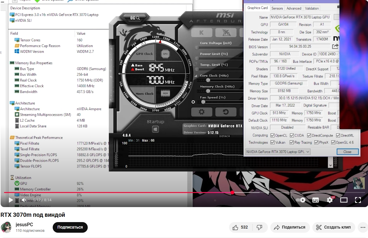 >>7519702 (OP) >3070m за 12-13к Бюджет на покупку бомж-пк у меня закончился, нужно продать что-то старое, по этому в отличи от п106-100\цмп30\40 проверить лично не могу. Вот наковырял инфы из интернета. Чип 3070м чуть слабее обычной 3070, в отличии от 3060м, там проц лучше чем 3060, но 3060м как по мне не стоит свеч. Частоты гпу у 3070м ниже, но она разгоняется до стока 3070, весь нюанс в меньшем ТДП. И вот с тдп непонятка, в разных видео по разному. В одном видео чел-ноунейм просто даунвольтит карту и она начинает держать частоту обычной 3070. Во втором видео, чел уже прошареный, рассказывает про заводской, китайский шунт-мод, из-за которого реальное потребление не 115ватт, а 200+ и по этой причине карта и получается аналогом 3070. Что в принципе логично, по тестам с ютуба 30700м отстает на 5-10% от обычной, и при этом имеет потребление аж в два раза меньше обычной? Сказка же. Из этого можно сделать вывод, что 3070м стоит аккуратно пихать в бич сборки на пердунах 300-400ватт. Еще попалось два видео с упоминанием того, что 3060м имеет разные ревизии, некоторые из которых не работают на обычных материнках