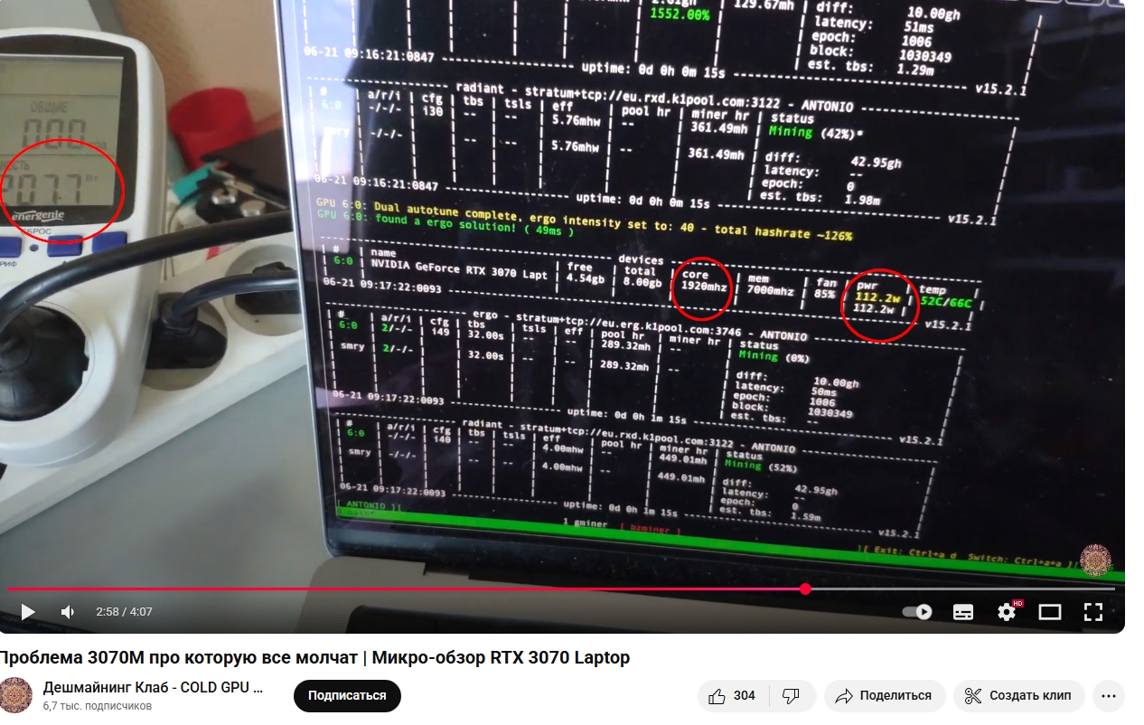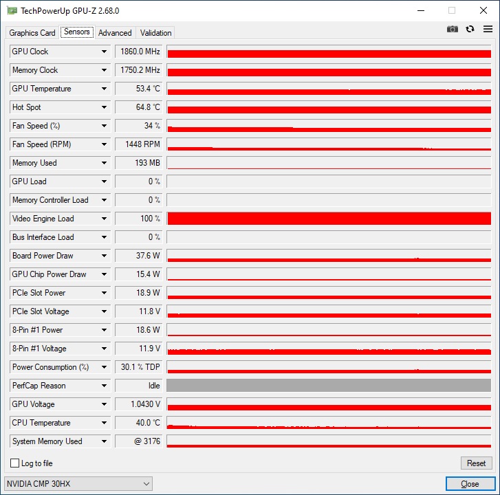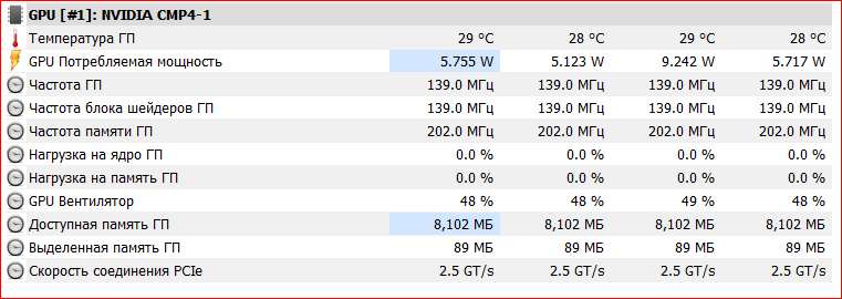 Штош. Подумал я, ну 2к деньги не большие. Брать на тест р106 за косарь как-то хз, тем более уже есть 470я и 1060. Возьму ка чисто фана ради сиэмпишку. Адекватно брать 30ю, максимум 40ю. Сгонял, взял в часе езды по пробкам у майнера карточку. От палита. Бодрая, без пыли, даже разбирать не стал. Под рукой оказалась пекарня с i7-4770hq кристалл вэл то есть. Встройка ирис 5200. В общем почти по мануалу поставил дровишки. Карта определилась как смп30. Потом переделал название на 1660 ти. Но сути это не меняет. Название ни на что не влияет. Вертушки всегда работают. Карта всегда жрет минимум 37Вт. Частота не падает, и всегда 1800+.