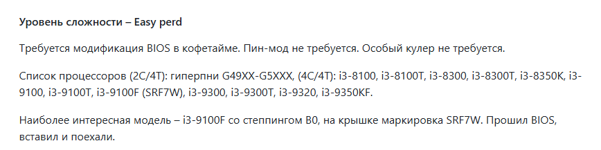 >>7532575 >дать ссылку на ресурсы/литературу по теме Вот держи: https://github.com/dartraiden/NVIDIA-patcher Это гитхаб с актуальным патчем и гайдом для видеокарты p106-100. https://github.com/mashiro-tan/chinese_1151_faq Это гайд по 1151 пердолингу, по сленгу двачер. >>7532575 >GIGABYTE GA-H110M-S2V >Intel i3 8100 По видеокарте все норм, а вот проц+мать конечно будет работать, но ты выбрал не самый оптимальный вариант. Самый оптимальный вариант, это 1225в6 с али за 1.2к и любая 1151\1151-2 мать прошитая под зион(нужно отключить МЕ-корпаратив), оптимальный он тем, что проц самый дешевый и минимальный пердолинг. Если брать 8100(проц хороший кстати) то нужно брать материнку 1151-2, обычно материнки такие дороже, но будет нулевой пердолинг, шить не нужно. Ты же выбрал под 8100 мать 1151, там нужно будет шить и возможно(если степпинг не подходит) то еще и клеить контакты, а это не оправданный дроч, легче и дешевле 1225в6 взять. С H110 похожая ситуация, либо тот же 1225в6, либо ай5 5-7 поколения, если прошивать не хочется, но опять же дороже выйдет. >400 вттный блок питания и кулер на 4 тепловых трубки? БП должно хватить, если исправный. Кулер оверкил, хватит за 100р >>7531849 >Корпус не нужен вовсе? Корпус желателен, хотя бы "остов" без крышек за 100р, такие отдают на разборках. Если без корпуса, то места много занимает, и появляется риск выхода из строя. >>7532661 >статтер проскочит Хочешь сказать, что нужно больше пруфов, скрина из бенча недостаточно?