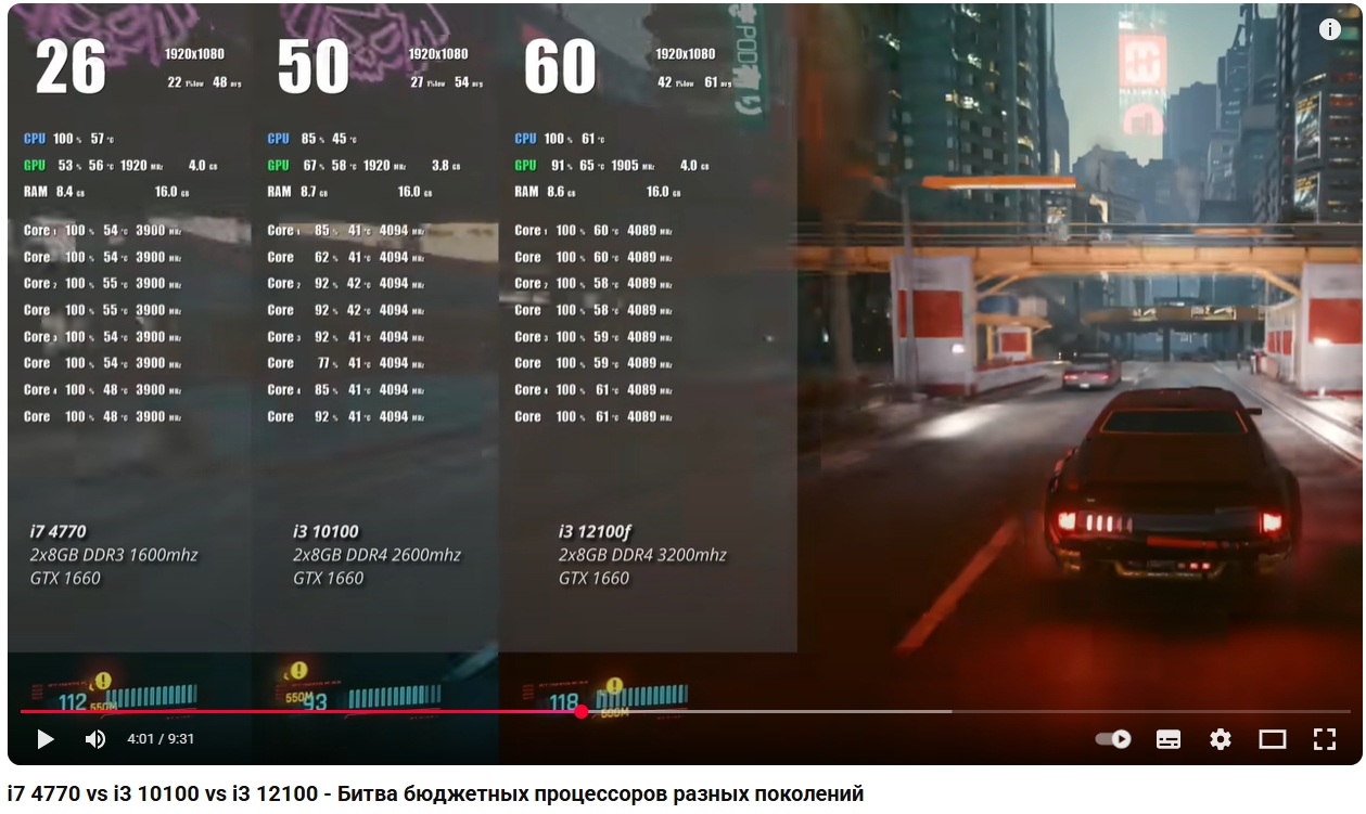 Ну вы тут устроили, 2011-3 перемога какая-то. Это все звучит как какой-то прогрев гоев от протыков, оторванный от реальности. Выше были тесты киберпанка, на минимальном графоне, и в реальности даже гиперпень на грани упора в видеокарту уровня 1060/470, а уже между 4/4 и 4/8 не видно разницы. Так же был тест с смп30(1660ы) где между 6/12 3.3 и 4.1 нет разницы. То есть бомжу выбирающему самый бичевский вариант на 2643в4 нужно брать как минимум карту 3070м(и всего скорей упор все равно будет в неё), но на минималках играть на карте за 13к мало кто будет. А вот эти 4куналы, фазы, разгоны в3, просто не нужны в рамках тренда, когда собираешь реальный компьютер, а не ради цифр в аиде/цпу-з.