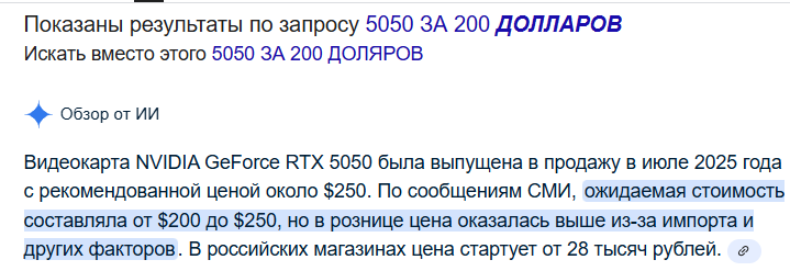 Какие сендики и 5050 чё ты несёшь. Во первых любой сендик споткнется о 50/50. Во вторых карта не лучшая по цене/рубль, лучше до 5060 докинуть. В третьих 200/250 баксов это дорого. Можно взять смп30 и играть почти во все современные игори за 2к рублей.