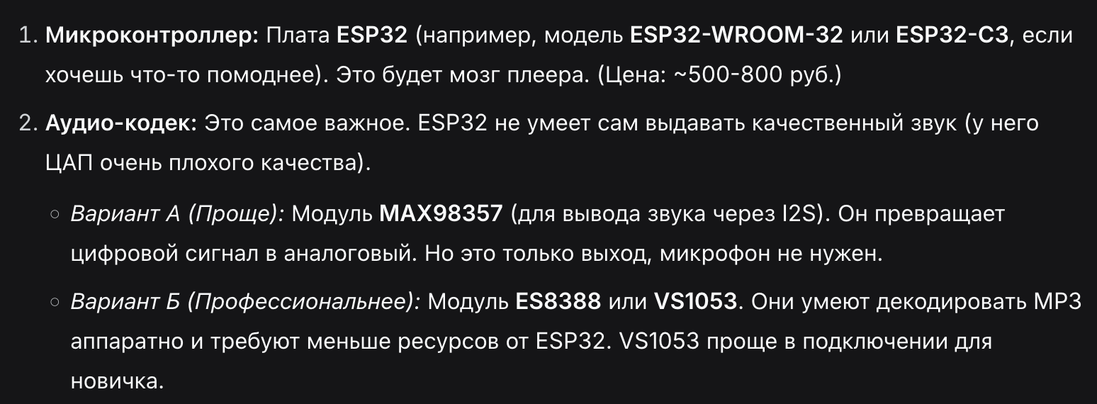 Аноны, хочу в качестве подарка сделать личный плеер человеку и заодно просто попробовать создать свое устройство с прошивкой и корпусом. Попросил дипсик предложить железо для всего этого и вот что он предложил. Как оцениваете?