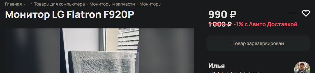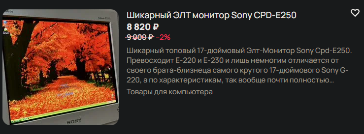 >>7551728 У меня схожая проблема, тоже ищу себе 19-21". В моём мини-городе на 600к вообще на авито ничего нет, только 17" за 500р и то изредка всплывает. С доставкой бы взял даже в пределах 3к по цене, не так жалко, но хуй там из-за веса, они ж от 20кг будут, такое не доставляет никто. Ниипу что делать, тупо ежедневно мониторю авито уже второй месяц, безрезультатно