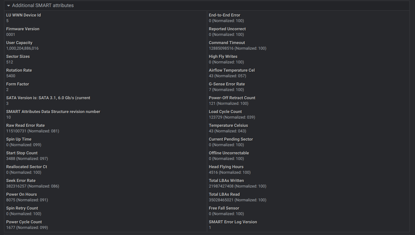 Это не очень адекватно для любого диска. Алсо, нейронки не совсем правы. RAW значение для Read error Rate - вендор-специфик и интерпретировать его без наличия сервисной документации (которой нет), нельзя. Там вообще по идее байтовый массив, в котором каждая группа байт означает тот или иной параметр. А прошивка диска делает нормализацию и пишет в raw, и это нормализацию нужно по таблицам вендора интерпретировать, т.к. этот параметр в стандарте Смарта не определен, вроде как. Короче, смарт ТВ ещё залупа. Буду ждать окончания тестов, прогоню ещё рид-тест, посмотрю есть ли ошибки в ядре и верну в пулл, мониторингом обвешу и буду наблюдать.