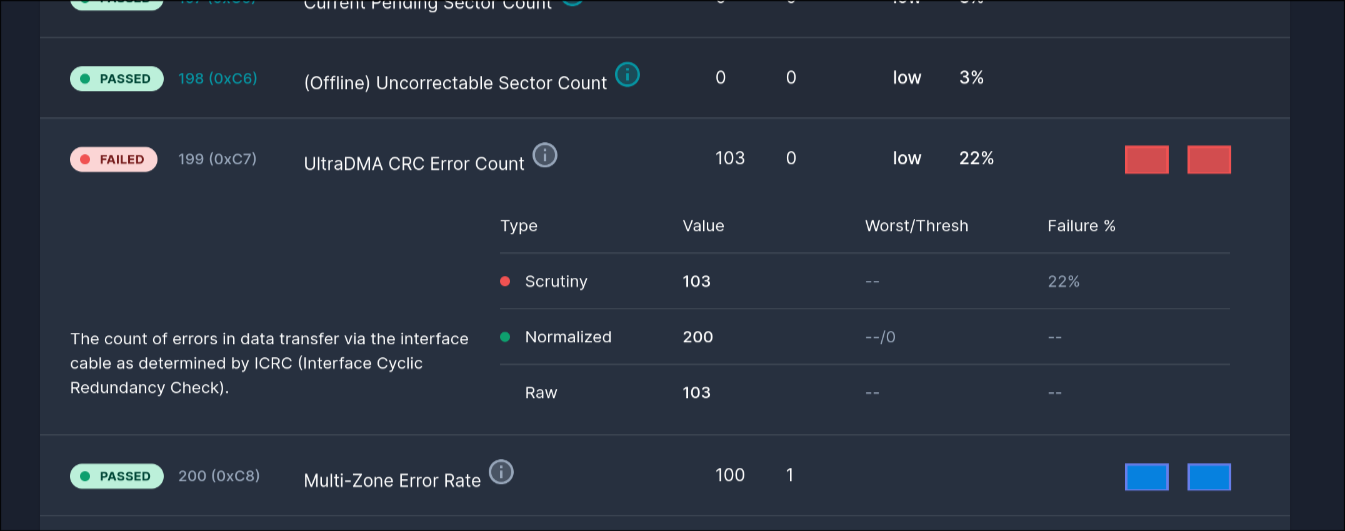 >>7528429 Ultra ATA CRC Error Rate - этот параметр полная хуйня. Это никакие не нечитаемые файлы, а ошибки передачи инфы по SATA интерфейсу. Из-за помех или негодного кабеля. Вот и всё.
