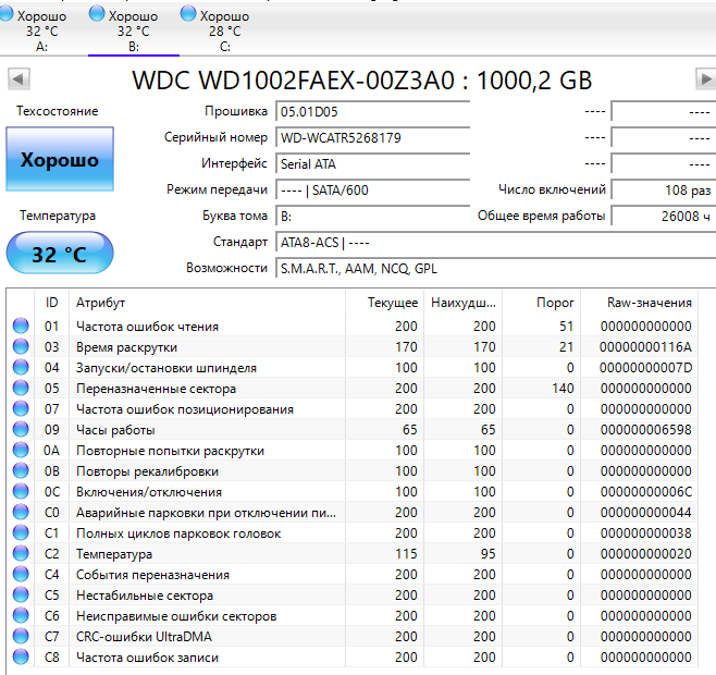 Я бы больше всего опасался параметров Raw Read Error Rate Seek Error Rate Reported Uncorrectable Errors Offline Uncorrectable Sector Count