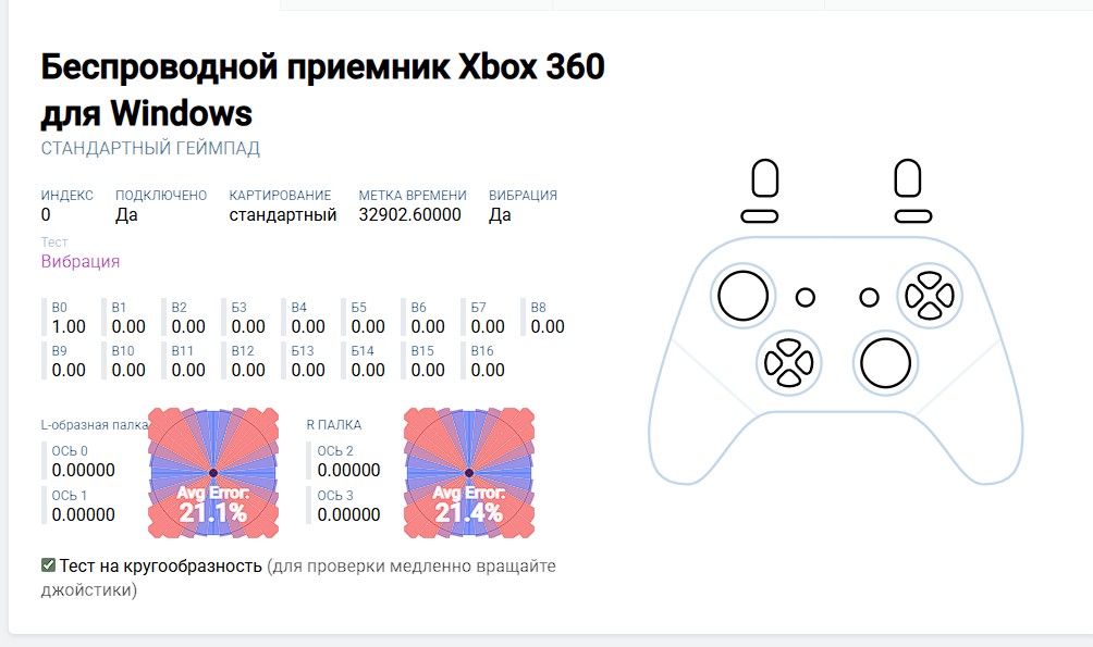 >>7532552 >>7532553 Это не софт, это сайт для поверки. > Вообще какой софт нужен для калибровки/диагностики гейпадов, кроме вендорного. Если с геймпадом всё норм - то никакой не нужен. > Мне скоро приедет первый гейпад (вэйдер про4) и хз как с ним ковыряться. Либо через софтину от производителя настраивается, либо через комбинацию на самом геймпаде. Зависит от геймпада. У тебя для этого мануал будет в коробке. На новом, исправном геймпаде ничего калибровать не надо. Если хочешь убедится в его исправности - просто вбей в гуголе геймпад тест, там кнопки проверишь, круги стиков, центр стиков и мертвые зоны (чем более квадратные - тем хуевей, до 12% приемлемо).