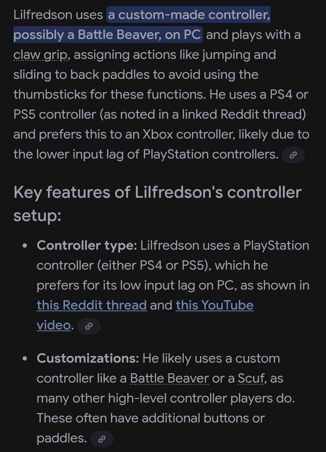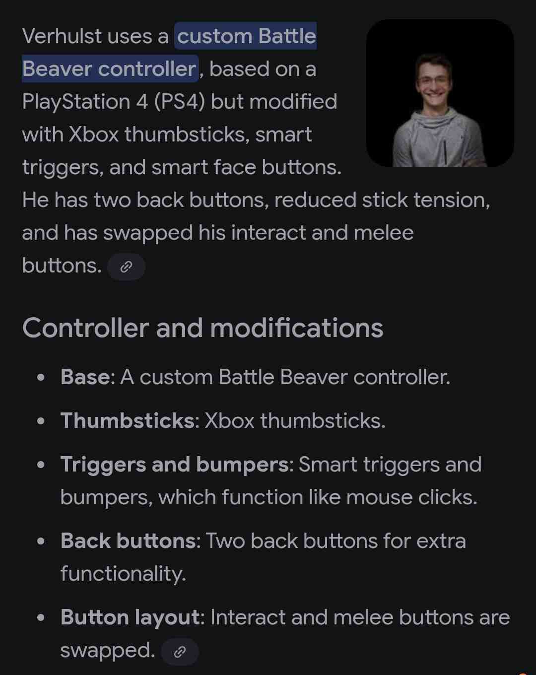 >>7533041 >Нет, тмр и холы чисто физически имеют большую задержку. Стоит датчик, который считывает положение магнита, потом преобразует это в удобное для платы значение, которое уже контроллер обрабатывает. С потенц-ми значение сразу на контроллер идёт, мимо датчиковой прослойки. Ок, с задержкой я перегнул. Но точность уж точно у ТРМ лучше как раз из-за всего того, что перечислил. Может быть только люфт маловероятен. >>7533095 Ну теперь я хотя бы понимаю, где ты меня обманываешь. Ты хотя бы проверял за нейросеткой. Профактчекал: https://liquipedia.net/apexlegends/Verhulst Тут написано про дуалсенс, а не дуалшок https://x.com/Verhulst/status/1705631445375492114 тут он пробует неделю пользоваться тем самым геймпадом, скорее всего, который твоя нейронка засчитала за основной https://prosettings.net/players/verhulst/ тут модифицированный хбокс + то же самое на ютьюбе