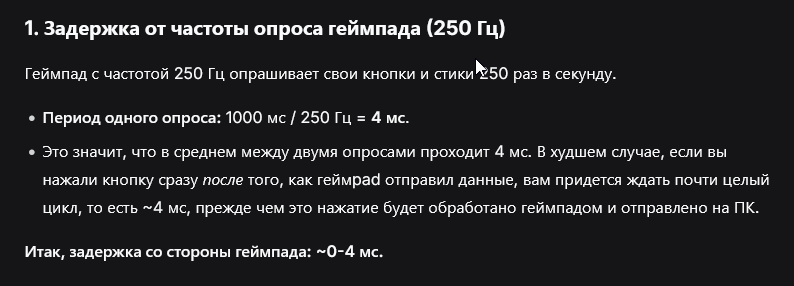 >>7539538 >>7539539 Причина подрыва? То, что игра почти всегда берёт «самое свежее» состояние к моменту рендеринга кадра, и более быстрый отчёт устройства уменьшает среднюю добавку задержки (≈0.5 мс против ≈2 мс у 250 Гц), даже если сама игра читает раз в кадр, вы, конечно же не учитываете. Ваше дело свидетельствовать о том, что человеческий глаз больше 24 кадров не видит, нормальных мониторов у вас нет, и играете вы на мышках за 400 рублей на валдбериз. Кому-то нравится плавность в играх, а кто-то мнит себя киберкотлетами.