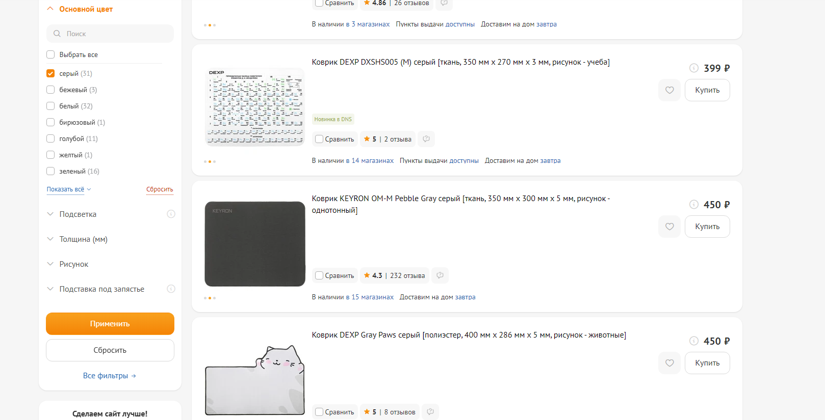 Мышач, никак не могу найти серый прямоугольный тканевый ковёр для мыши с прошитыми краями, не широкий. Везде только чёрные и разноцветные, широкие с аниме и прочие срально-геймерские. Мне нужен серый или темно-серый, разве я много прошу? Нашел только Artisan, но я же не ебанутый 7к за ковёр отдавать.