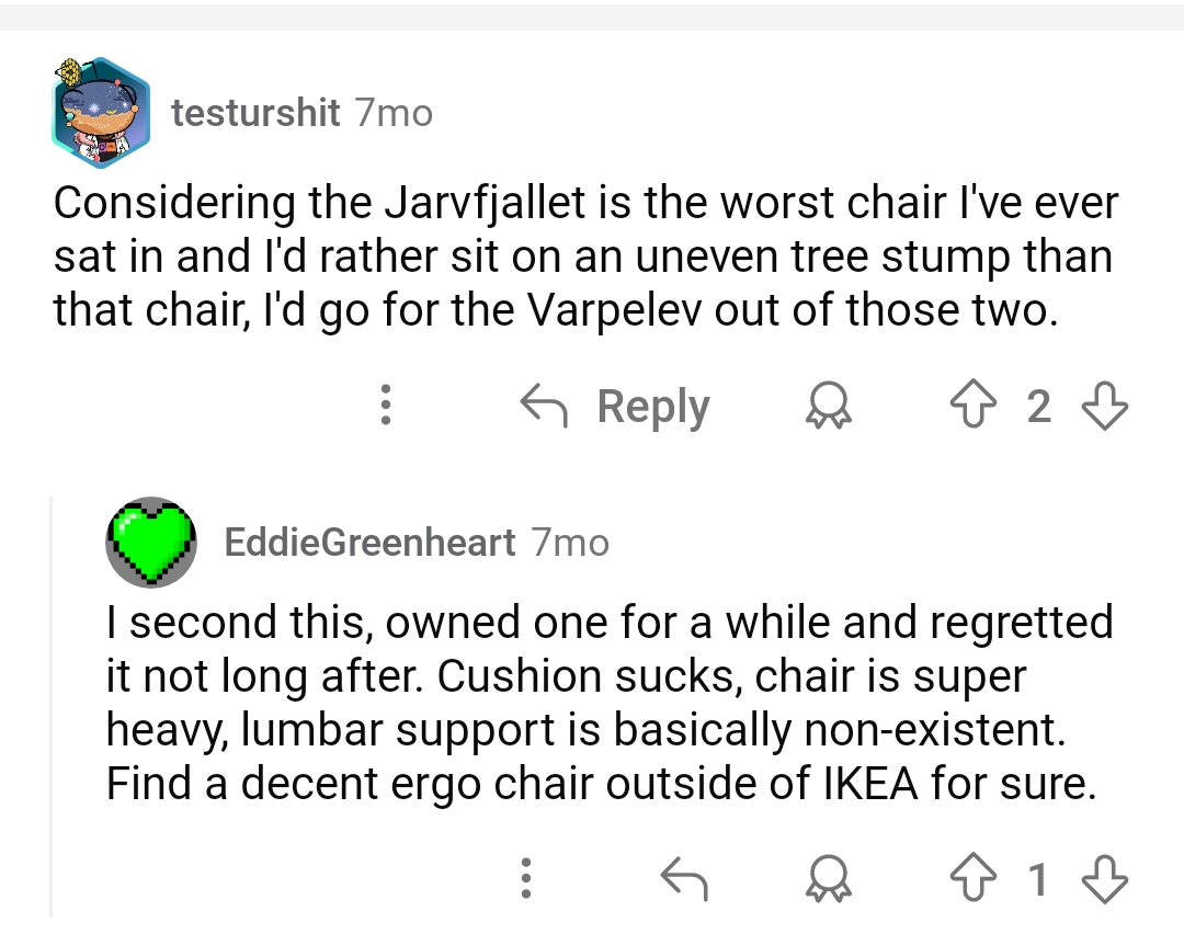 А теперь подумайте, с какой целью на реддите сидит миллион акков в сообществах выбора кресел и каждый день всем советует купить кресло как у них?