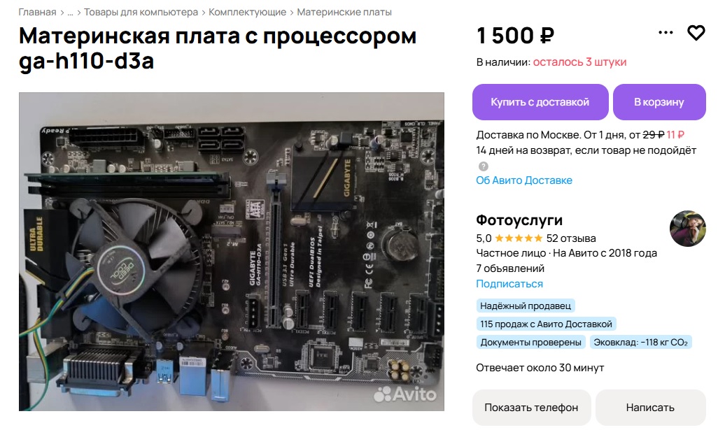 Эпопею с 1200 сокетом можно закрывать, распродал почти все, остался только селерон и -2000р убытка. Для тех, кто не в курсе, или забыл. Увидел на озоне материнку б560м лга1200 за 1650р, ну и желание пощупать железо новее 1151 уже было не остановить. Купил 10400ф по низу рынка, у барыги с 30 отзывами, в последних был 1 хуевый отзыв, какой-то юсб провод от зарядки не понравился покупателю, ну явно же не повод не верить барыге. Пришел проц, но ничего не работает. Хуево, что и в материнке не уверен, отзывы разные на нее, то видеокарта у кого-то не работала, а у меня проц без встройки. Купил еще калплект на н410+селерон, что бы навярняка, материнку с селероном проверить, а ай5 на другой материнке. Проц труп. А б560м в принципе норм, видеокарта не работала у челиков т.к. в биосе вырезан режим цсм, нужна видеокарта с уефи. Скинул материнки, проц выставил за 500р как брелок, и тут началось, за пол дня написало 4 человека, один халявщик, пытался узнать, может это я долбоеб в компах не понимаю, а он купит рабочий проц за 500р, 1 нейтрал, наебщик в отзывах кому-то сломанный электро самокат продал, наебщик2 продавец палёных процессов, он и заказал в итоге. Ну вот держите пикрил, 100+отзывлв 4.7рейтинг, уже продал мой ай5 по низу рынка. Я кстати написал отзыв тому гандону с 30 отзывами, у него рейтинг и не просел, а с того момента он уже 4мя 5ками перекрыл. Всем желающим собраться на хайповых сокетах, покупая проц с авито, желаю удачи.