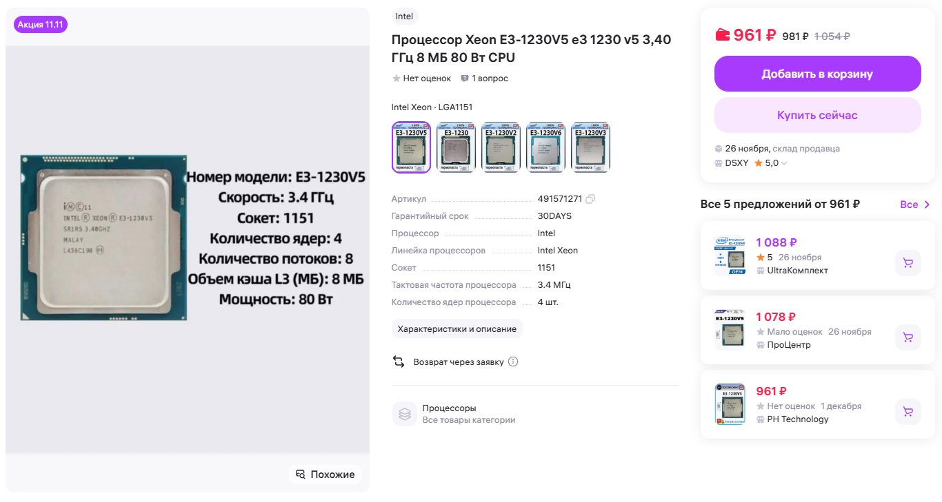 4\4 со встройкой, 1225v6 за 1.2к, а так же i5\i3(4\4) за ту же цену + видеокарта п106-100 и цпм 30