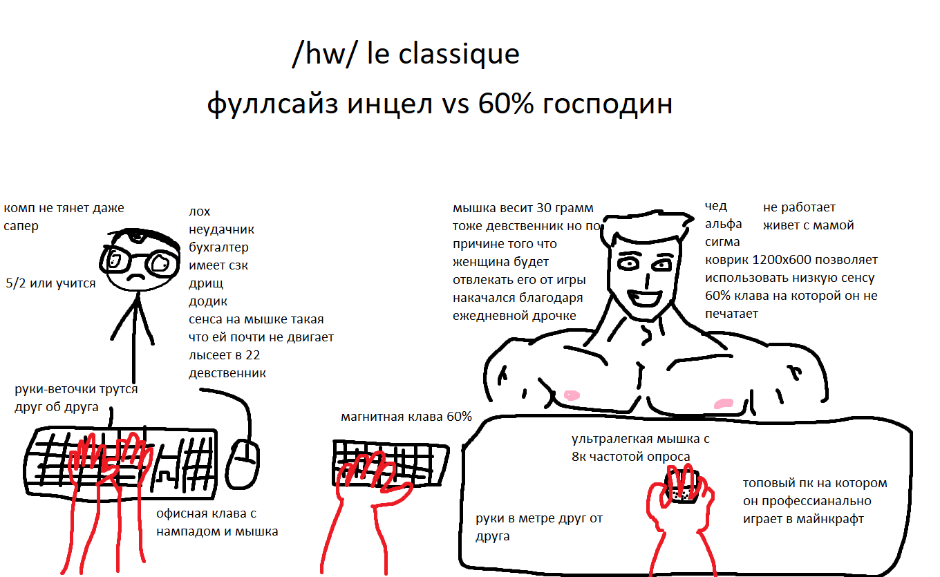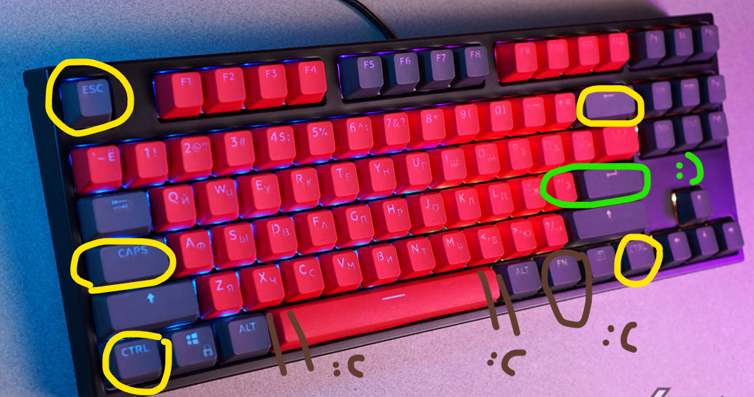 и, если честно я вообще не понимаю как в принципе 99,99% хомячков сидят с разнесенными ctrl, с ебучим бесполезным капслоком, с энтером через 2 клавиши, с забоем до которого вообще нужно мизинцем тянутся как до камчатки лол и эскейтом который так же находится в жопе мира если вы печатаете вслепую десятью пальцами то у вас нагружены мизинцы а 99,99% клавиатур еще больше его нагружают если вы работаете в емаксе или виме либо пользуетесь их клавиатурными режимами в других редакторах, вам пиздец как важен удобный доступ к ctrl и alt ибо все заточено на то что вы одной рукой прожимаете модификатор а другой клавишу так получается быстрей и меньше нагружаются запястья настоящее безумие абсолютное большинство клав вообще не продумано с точки зрения эргономики зато да быдло дрочит на подсветку а псевдо-элита на звук щелканья механических клавишь кретинизм