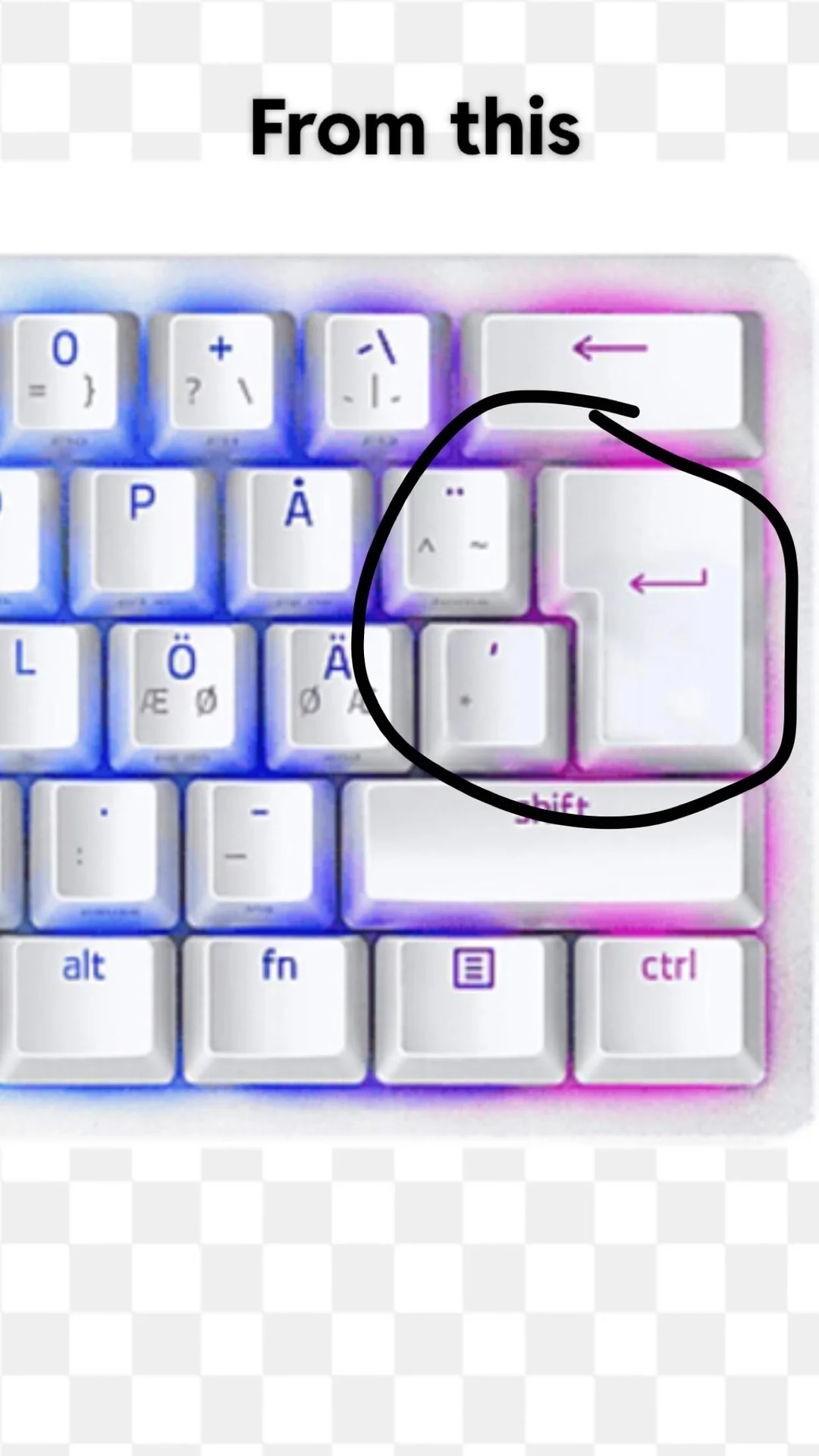 вот здесь вроде как: близкий enter забой спущу вниз к enter esc спущу вниз убрав тупорылый capslock слева свайпну ctrl и win все это окей НО уже чувствую подводный камень: ибо ебучий fn скорей всего нельзя переназначить и справа я не смогу пододвинуть ctrl к alt и так же пробел обычного размера и поэтому alt не будут идеально ложиться под безымянные пальцы а чуть-чуть враскоряку