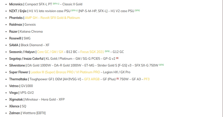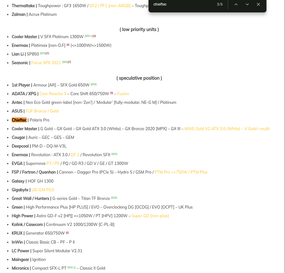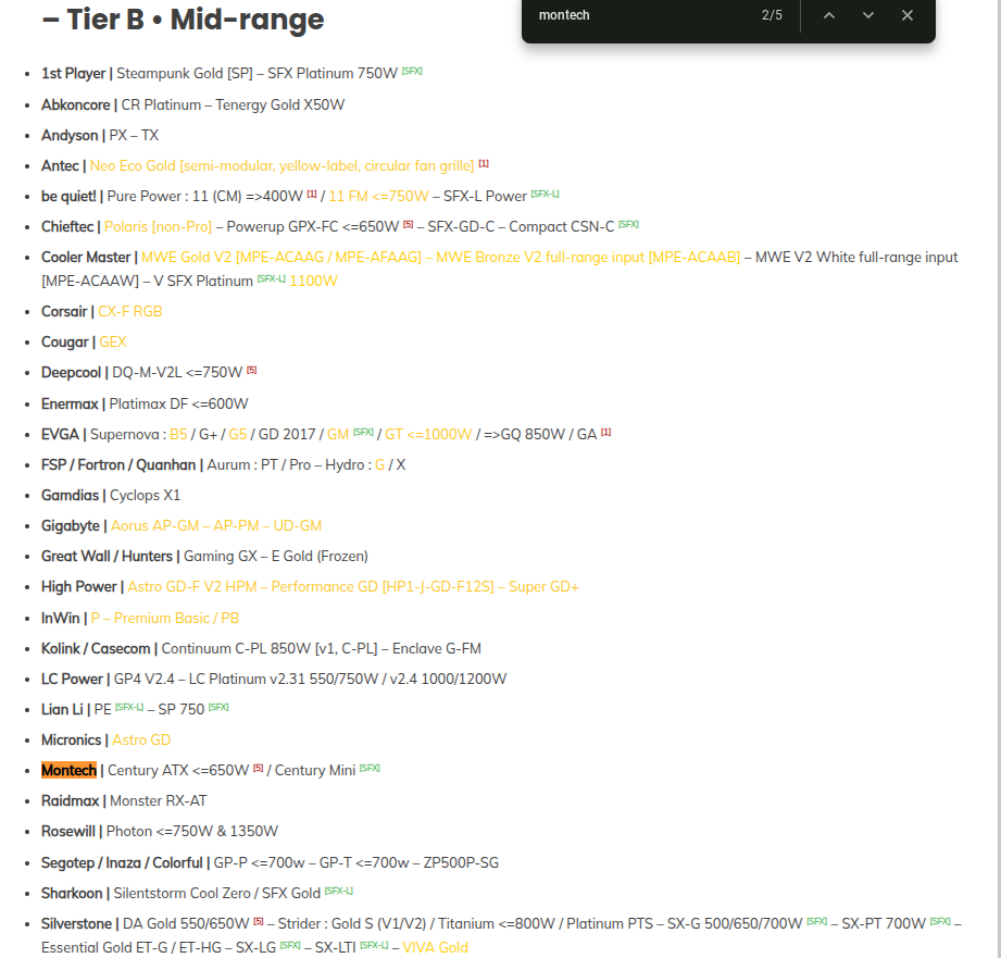 >>7563197 кстати да, есть один сайт тирлист бп, он конечно не обновлялся с 23 года, но все же твой дипкул там в тир Е, а вообще грубо говоря можно брать тир А и В, на крайняк С, золотым и синим текстом лучшие модели тира как я понял, синий<золотой сайт хоть и не обновляется но как будто все равно неплохо когда ты вообще не разбираешься в блоках питания, а хуевая модель может быть и у хорошего производителя типа тот же монтеч или чифтек