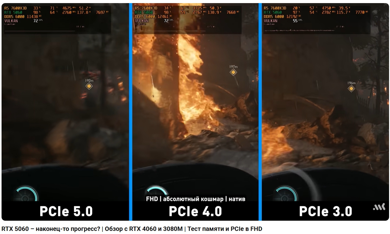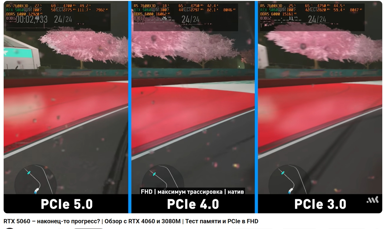 По поводу пси-е 3.0 х8, даже при условии, что нет упора в видеопамять, без псие 5.0 происходит посос. Что забавно, протык с ютуба говорит, что все нормально, а видеоряд на фоне говорит о обратном.