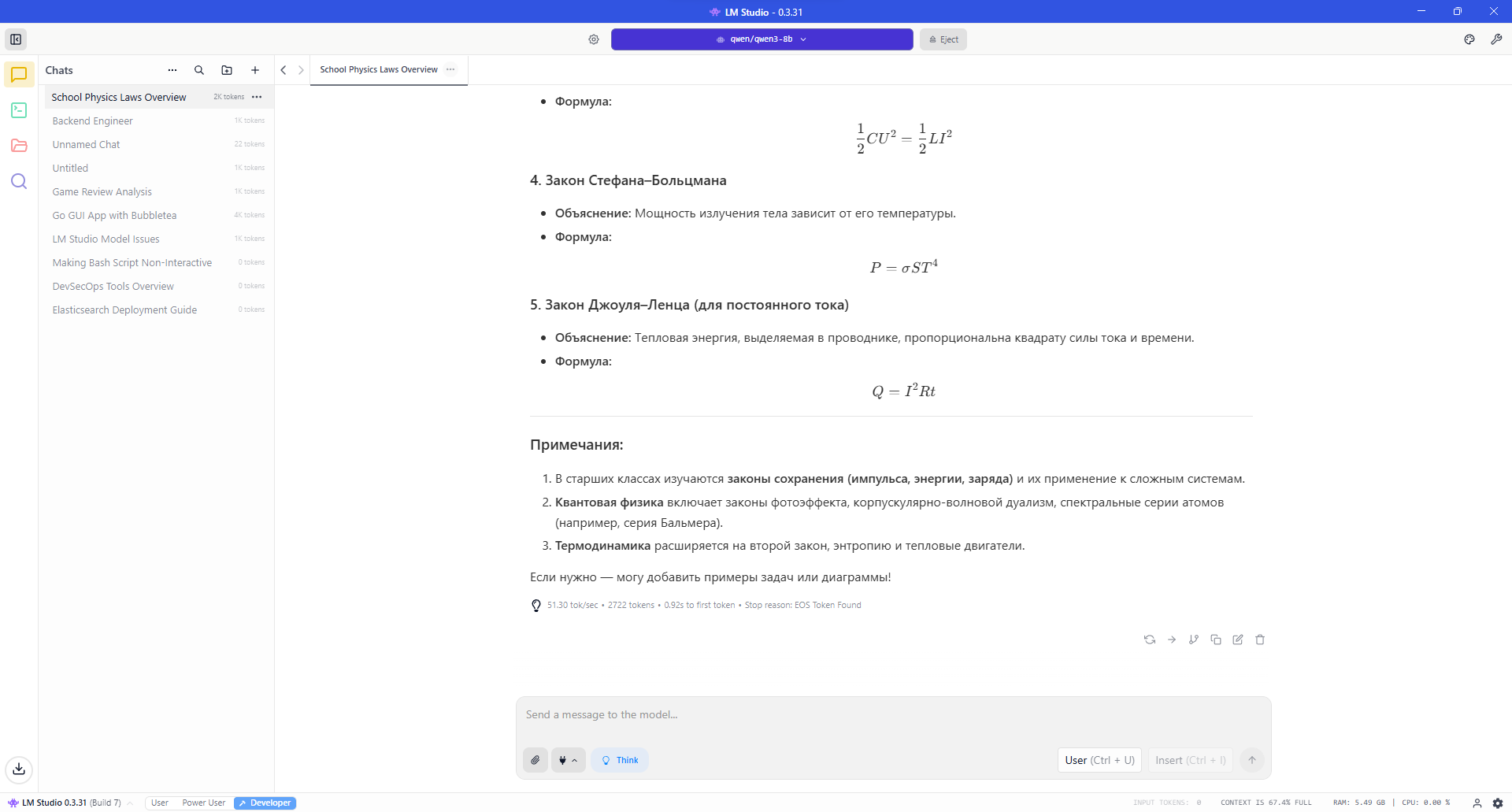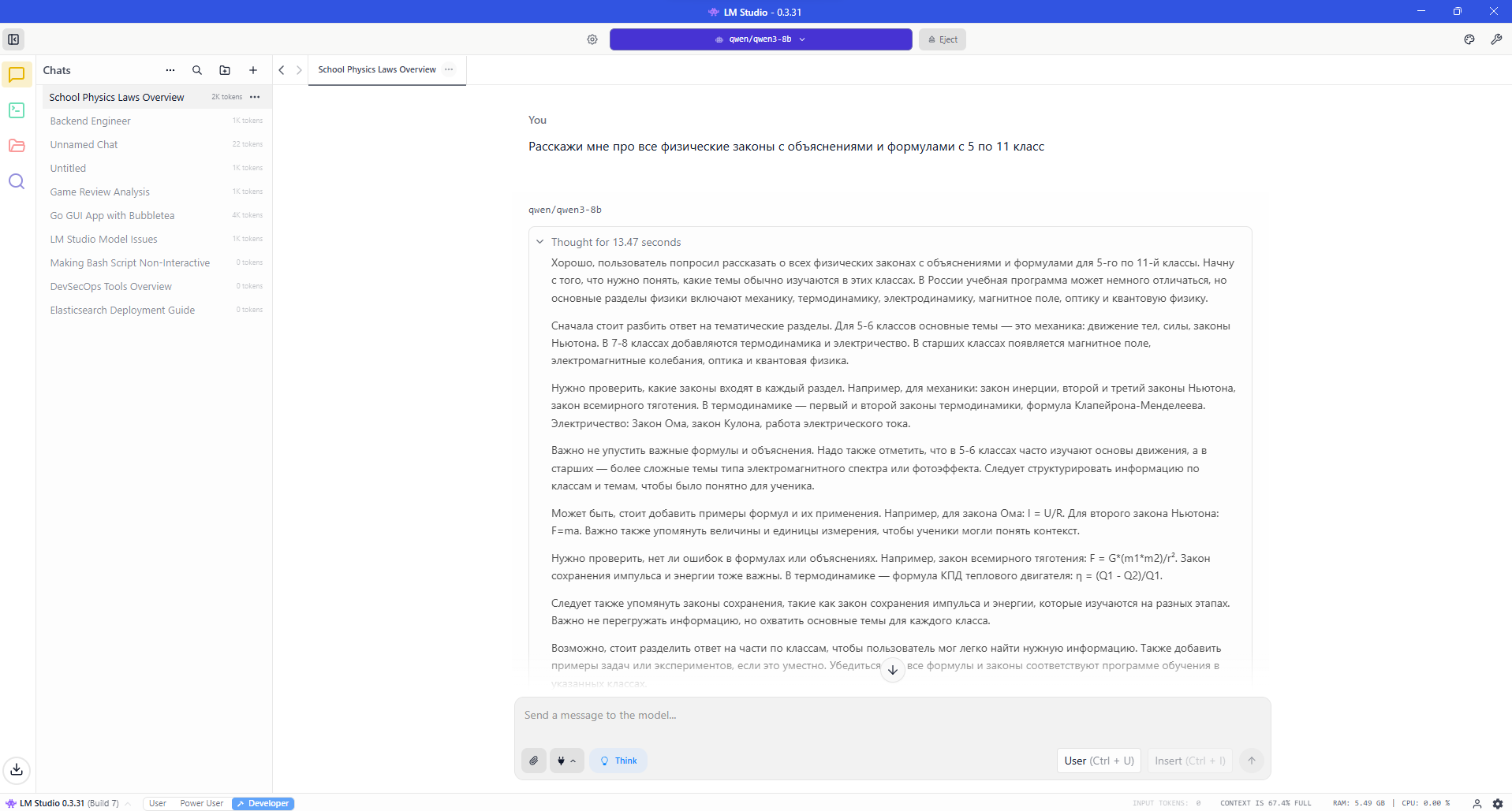 >>7573893 Грузи LM Studio, загружай в нее модель qwen3-8b с дефолтовыми параметрами, загружай модель в память, создавай новый чат, запрос "Расскажи мне про все физические законы с объяснениями и формулами с 5 по 11 класс"