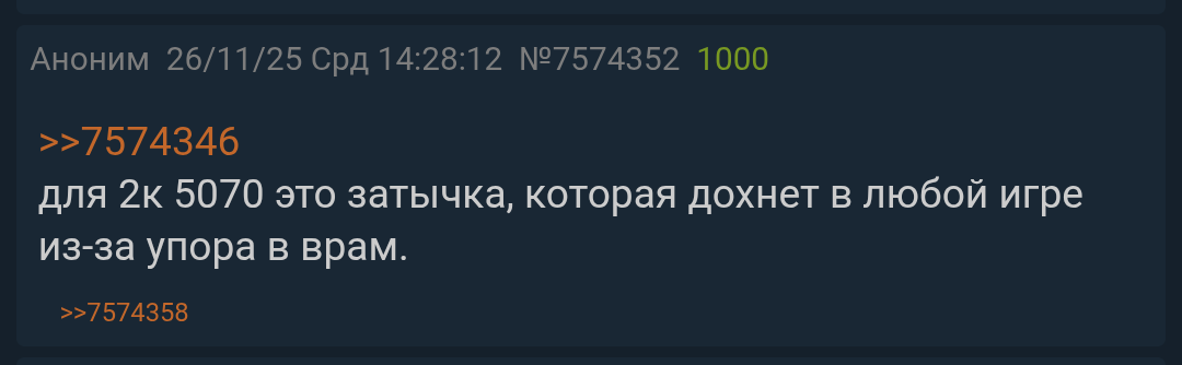 >>7573153 Это не только печка на 300 Вт, пережившая не одну волну майнинга, на неё ещё и дрова новые перестали выпускать. И что она даст в особо требовательных играх без быстрой подсистемы памяти, которая сейчас на вес золота ? Конечно гораздо разумнее купить 9060 XT или 5060 пока они ещё не закончились по доступным ценам. А потом если повезёт до сентября обновить остальное.