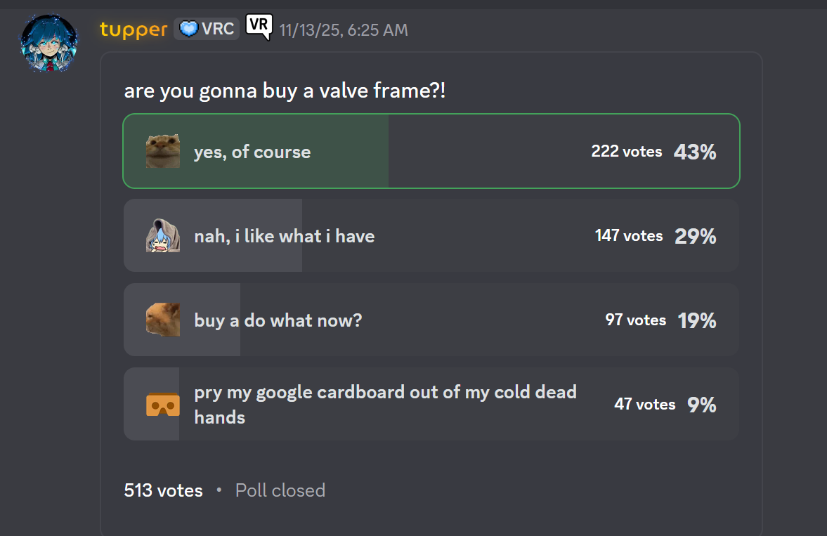 >>7579537 >Вот, например, опрос с сервера вр-чата, там дохуя народу тоже фрейм брать собирается Да, пока цену не знают конечно собираются) Я бы тоже ответил да, но если цена $800 то нахуй пусть жироблядок похудевший яхотоблядский гойбен идет, особенно когда рынок полный бу квестов 3 за 300 бачей
