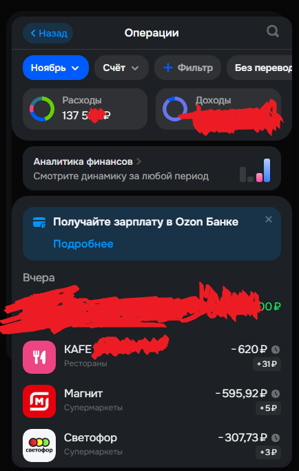 Кстати там жирные кешбеки если ей платить в магазинах и кафешках, от 1 до 5%. 5% иза заправку на АЗС, кафешки и оджду обувь. регулярно при моих скромных тратах кешбека в месяц падает штуку -полторы, + цены при покупках на сай озон на порядок ниже.