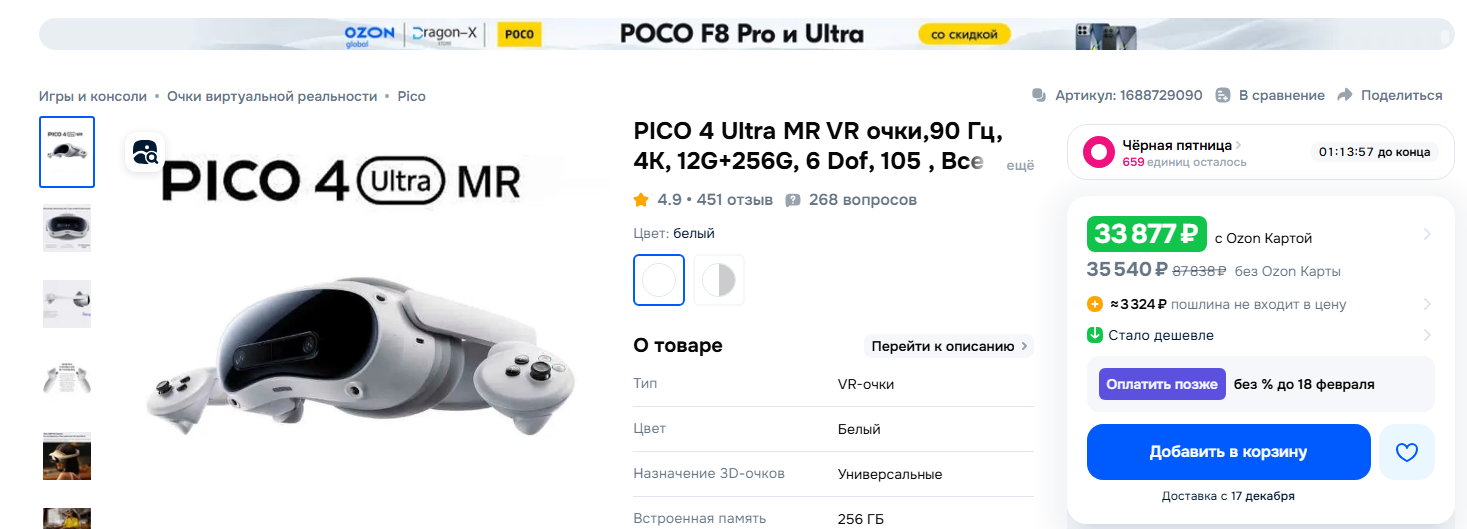 На озоне прямо сейчас можно купить новый пико4 ультра за 33 + около 3 к таможенный сбор, итого 36 тыс руб.