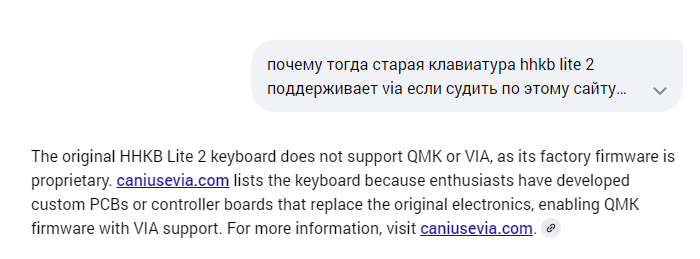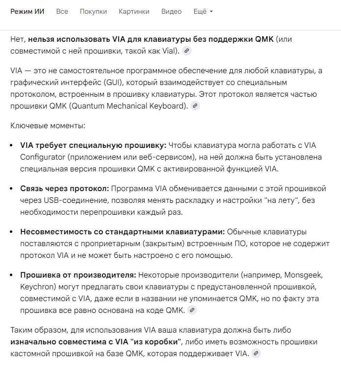 >>7588414 Как я понял QMK/VIA для брендовых клав вроде не тоже самое, что QMK для handwire. У них вроде как нельзя просто создать профиль клавы, создать мапу и прошить через qmk cli. Им нужны какие то свои тулзы, которые еще и к тому же только через браузер работают. Анально огороженный QMK. Но мб ошибаюсь, пусть аноны поправят, если обосрался.