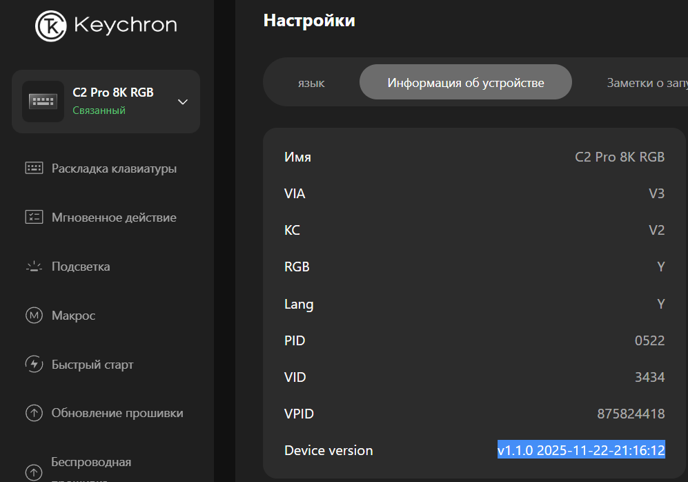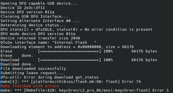 В общем небольшой отчет по keychron c2 pro 8k. Все зашибись, собрал прошивку и накатил в клавиатуру. Пока ничего не модифицировал. Обосрался немного с 2 скрина, но это наверное какой-то чекер в конце не сработал (прокидывал usb dfu в виртуалку на линуксе и оттуда шил, потому, что драйвер на win11 не встает)